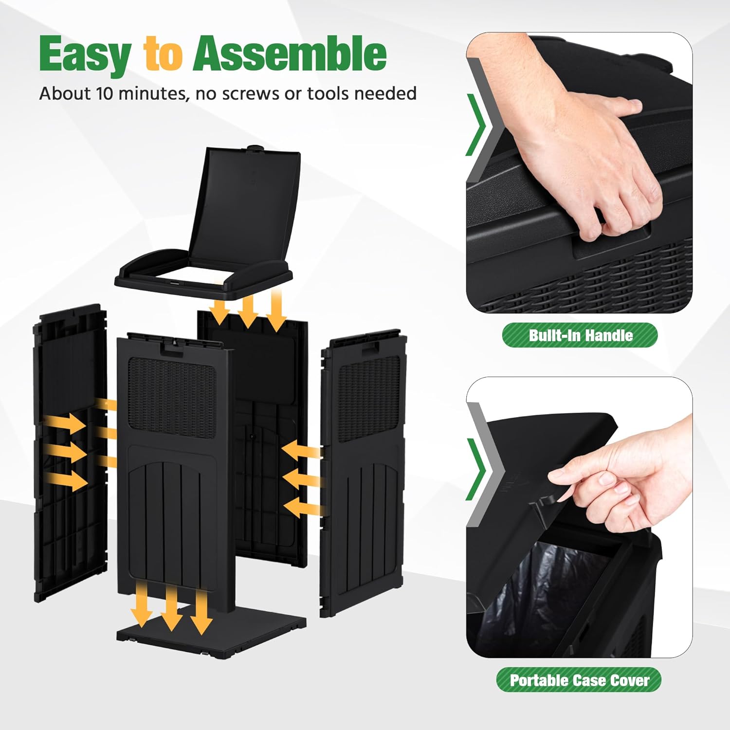 - Easy to Install Trash Bags: The waste bin for outdoors is compatible with 30-33 gallon trash bags. You need to lift the trash bag holder, put on the trash bag, put down the holder, and then finish the installation. After opening the inner lid, the garbage bag can be stably fixed in the card slot