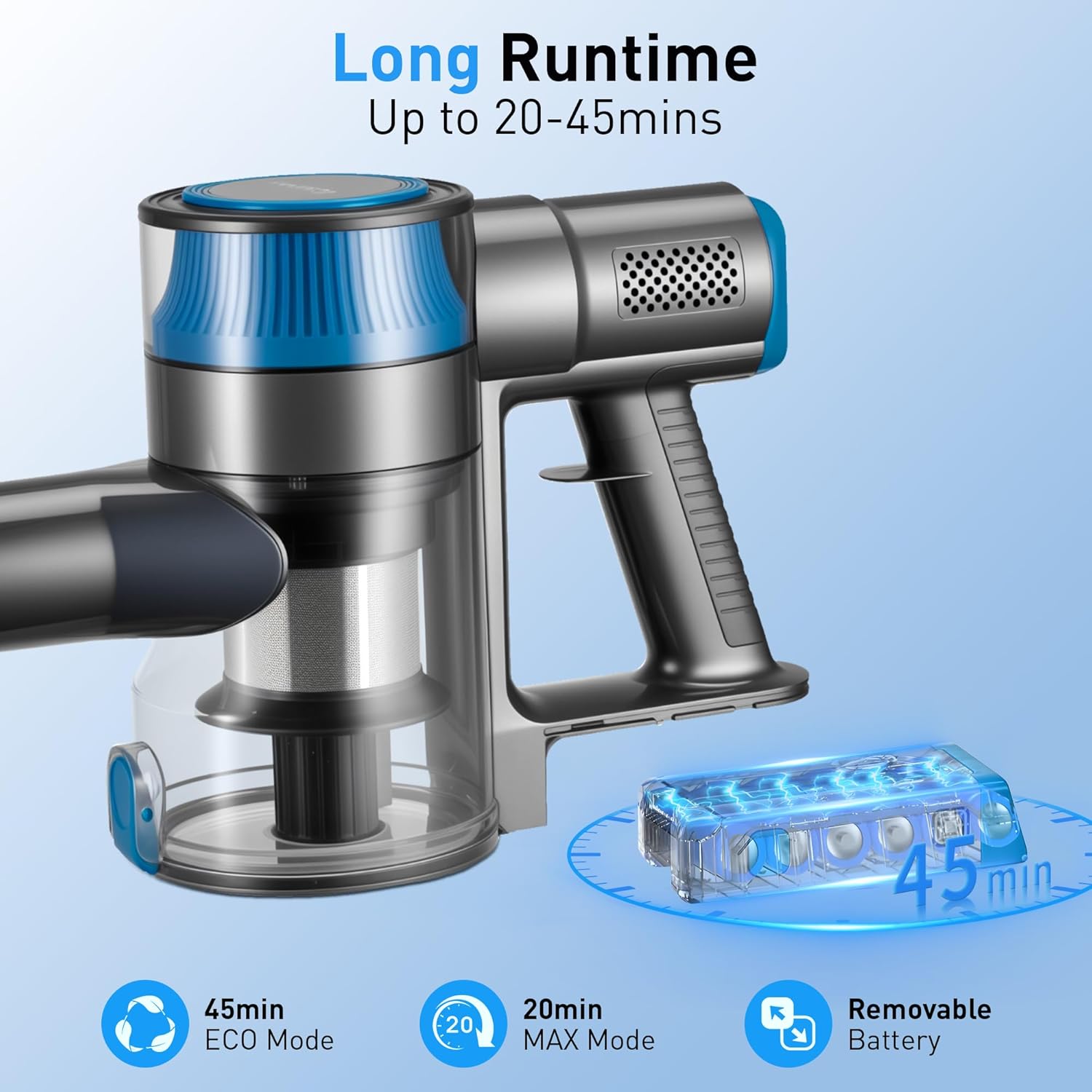 - Detachable 6Γ2200mAh Battery (45mins Runtime) β A single charge powers 45 mins of cleaning in Eco Mode (enough for 1500 sq.ft homes) or 25 mins in Max Mode for tough spots. The battery detaches easily: charge it separately while using a spare (not included) β no more waiting for charging to finish cleaning. Pro Tip: Fully charge the battery before first use for longer lifespan!