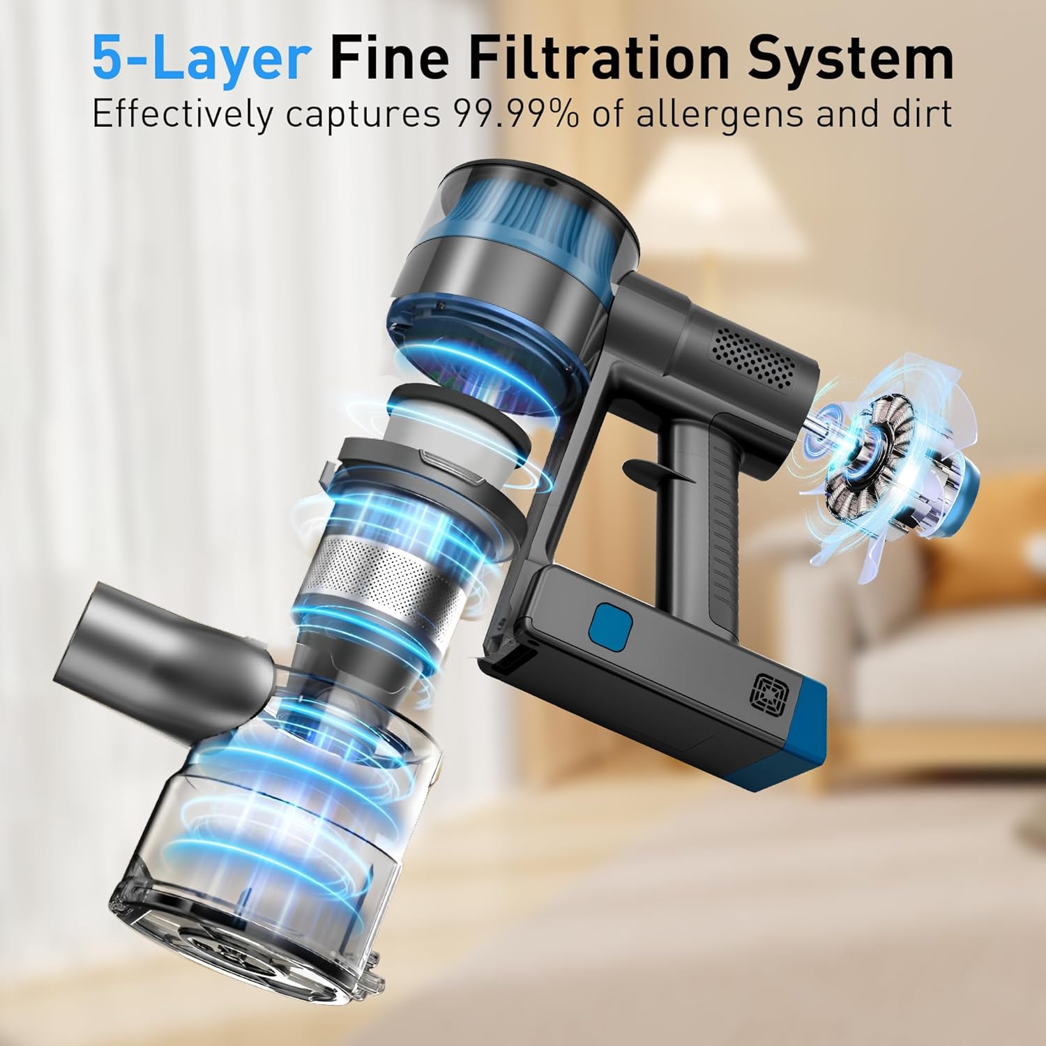 - 5-Stage HEPA Filtration (Allergy-Friendly) β Our cordless vacuum traps 99.99% of dust, pollen, and pet dander (as small as 0.3ΞΌm) β perfect for allergy sufferers and pet owners! Unlike cheap disposable filters, this HEPA filter is washable with water: rinse, dry, and reuse β save money on replacement filters for years.