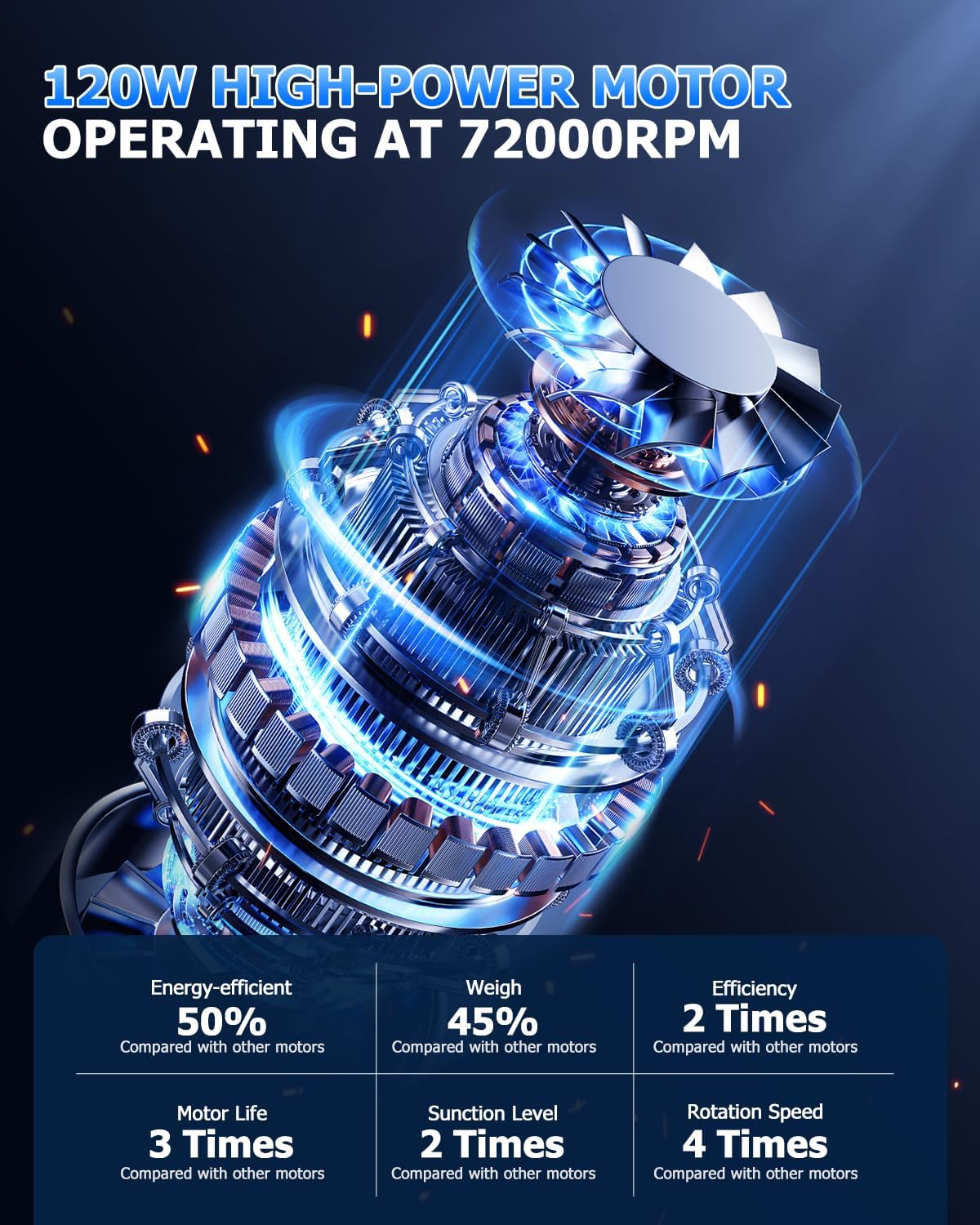 - đŞď¸ă16000PA Strong SuctionăThis handheld vacuum cordless is equipped with a high-powered motor that operates at 72,000 RPM, generating a strong suction power of up to 16,000 PA. With such suction, it easily cleans up scattered dust and debris on the floor, tangled pet hair in carpets, and stubborn dirt deep in hard-to-reach corners. Its efficient cleaning capability allows you to quickly restore a clean environment without much effort, bringing you a more comfortable living experience
