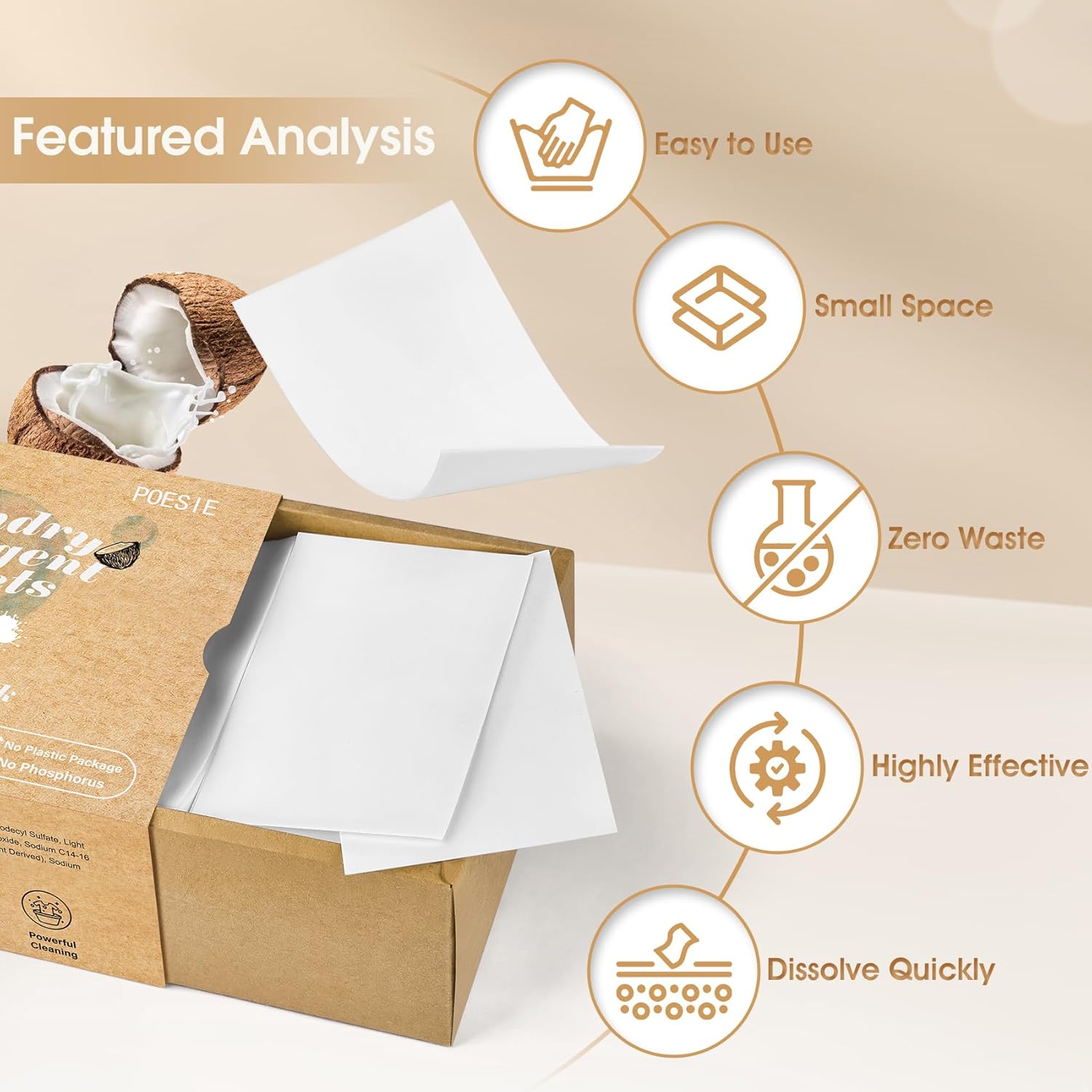 Poesie Laundry Detergent Sheets Coconut Milk Scent 160 Count Non Plastic Jugs Portable Laundry Soap Sheet for Clothes Washing Indoor and Outdoor Essentials
