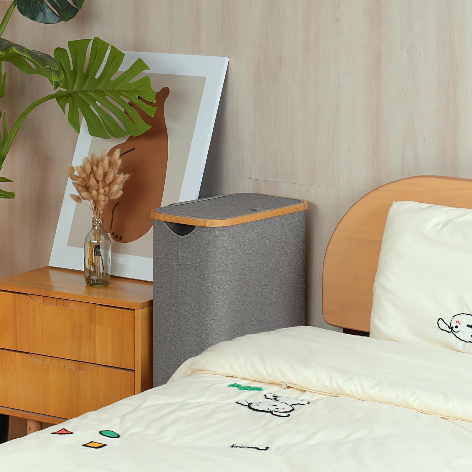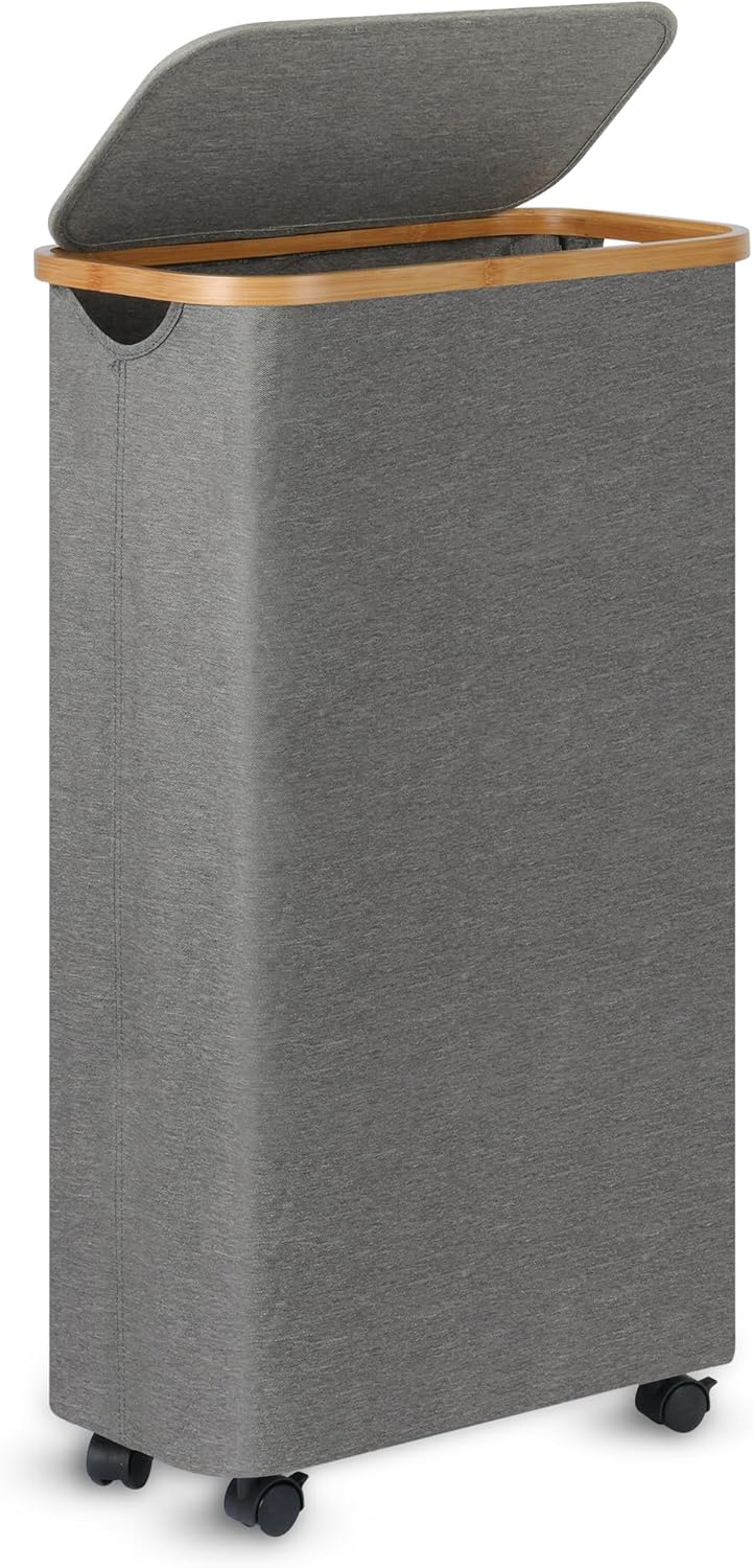 Slim Laundry Basket with Wheels,Narrow Hampers for Laundry, Laundry Hamper with Lid&Bamboo Handles,Dirty Clothes Hamper for for Bathroom Bedroom Dorm, 60L Grey