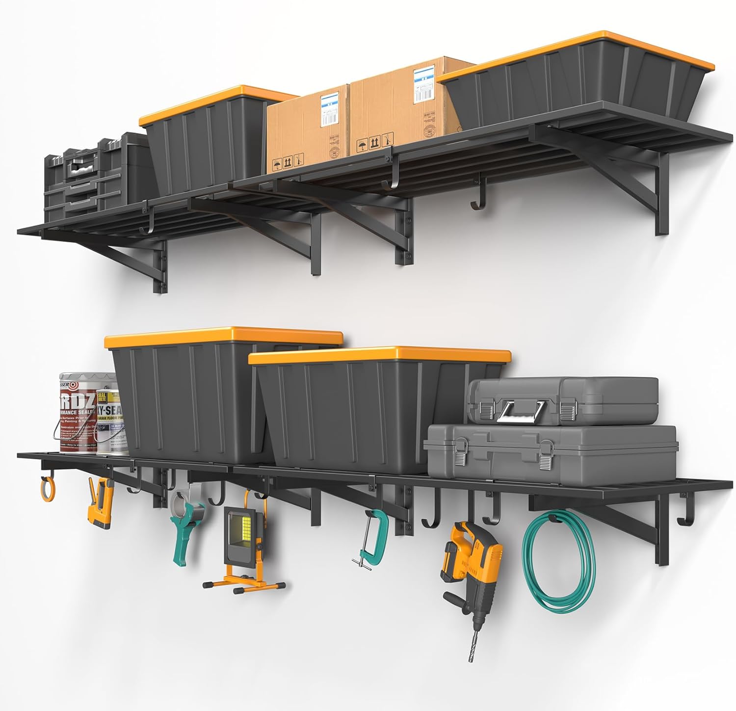 - HEAVY-DUTY GARAGE SHELVING: Our 4-Pack wall-mounted shelves provide generous storage, featuring two 1.5'x4' shelves per unit. Built from heavy-duty steel, each shelf holds up to 200 lbs, offering a combined capacity of 800 lbs. Ideal for garages, warehouses, offices, and beyond, these shelves are designed for durability, stability, and efficient space organization