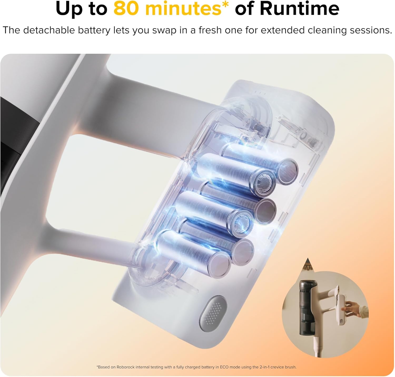 - Up to 80 Minutes of Continuous Cleaning: Clean large areas without interruption with up to 80 minutes of runtime. The removable battery of the vacuum cleaner allows quick swapping and recharging, so you can finish bigger cleaning tasks with ease.