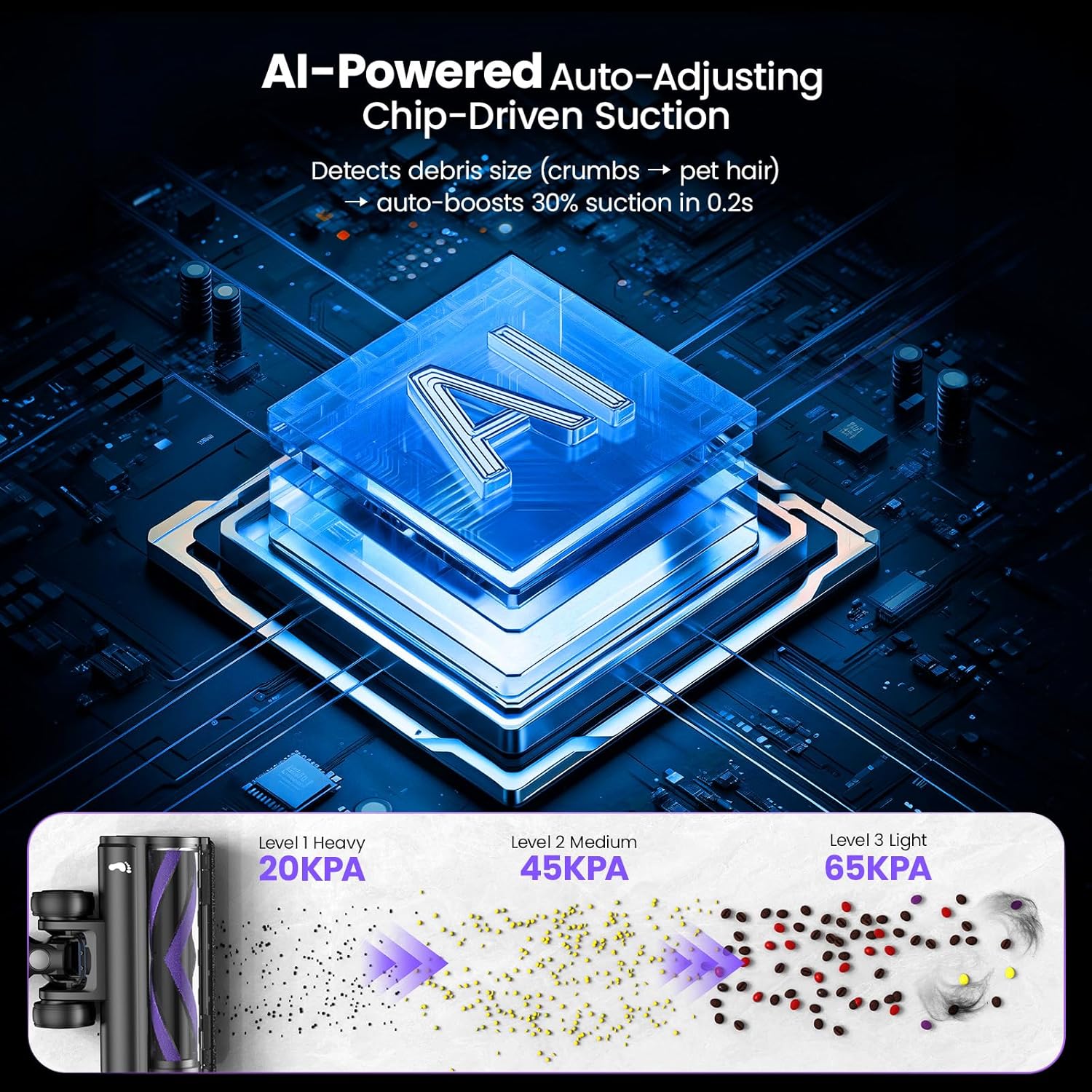 - [AI-Powered Auto-Adjusting] Experience intelligent cleaning with Airpher’s AI-powered chip that instantly senses debris size—from crumbs to pet hair—and boosts suction 30% in just 0.2s. This cordless vacuum cleaner automatically adapts to your mess for optimal performance and battery efficiency, making it one of the smartest vacuum cleaners for home