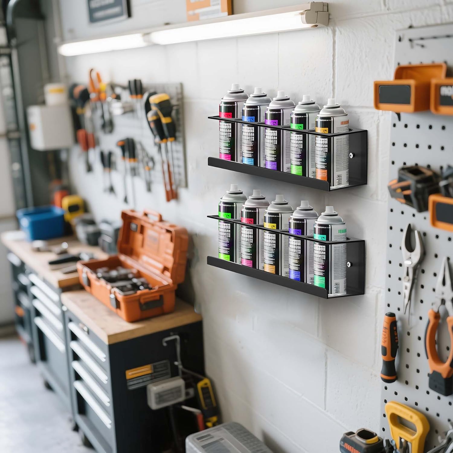 - Space Saving: Spray can holders are suitable for garage, store or home work space. You can arrange 4 spray can rack according to your preference, the wall-mounted design makes full use of wall space, eliminating ground clutter, keeping spray cans, cleaning agents and other tools within reach, and greatly improving the space utilization of garages, kitchens and workshops
