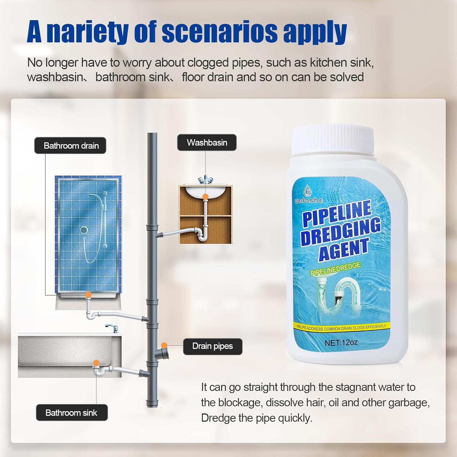 - [Multiple Uses] - This pipeline dredging agent works great in kitchen sinks, bathroom drains, shower pipes, and even grease-blocked floor drains. Helps support routine maintenance and reduce the risk of clogs in daily use.