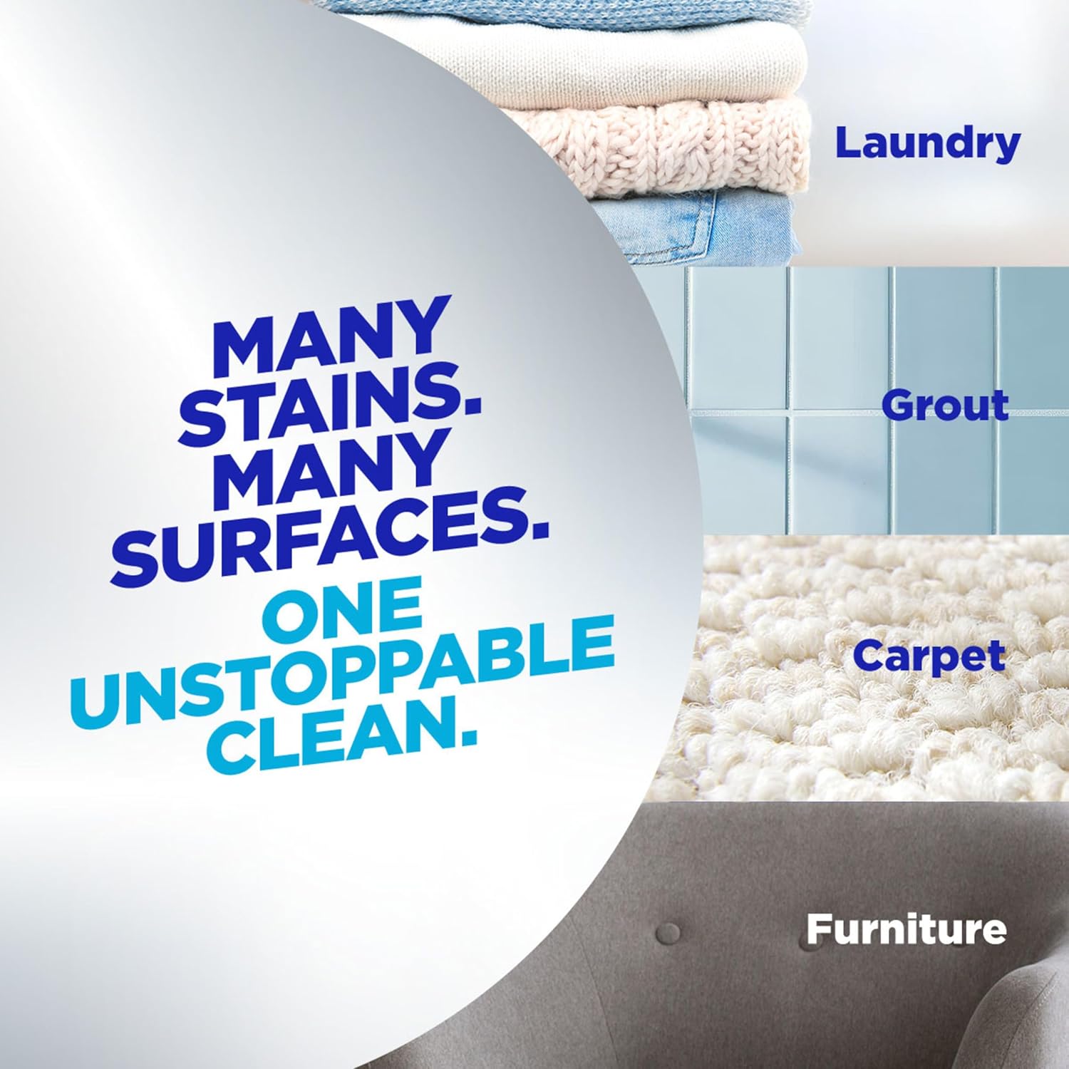 - 3X STAIN FIGHTERS vs. leading value detergent alone per load; use this laundry additive in every load to remove stains; at home on surfaces like grout, upholstery, carpet, and patio furniture; with 101 cleaning and stain-fighting uses for home and laundry
