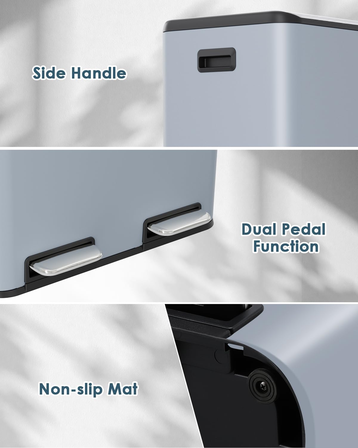 - Dual 8 gallon Compartment Bins: Trash can measures 20.3in * 14.6in * 26.2in. With a large capacity of 60 liters, it offers plenty of room for garbage and recycling, Combo garbage bin comes with two removable inner barrels, and each compartment has an independent lid and a widened pedal, which effectively isolates the smell of garbage and facilitates the opening of each compartment.