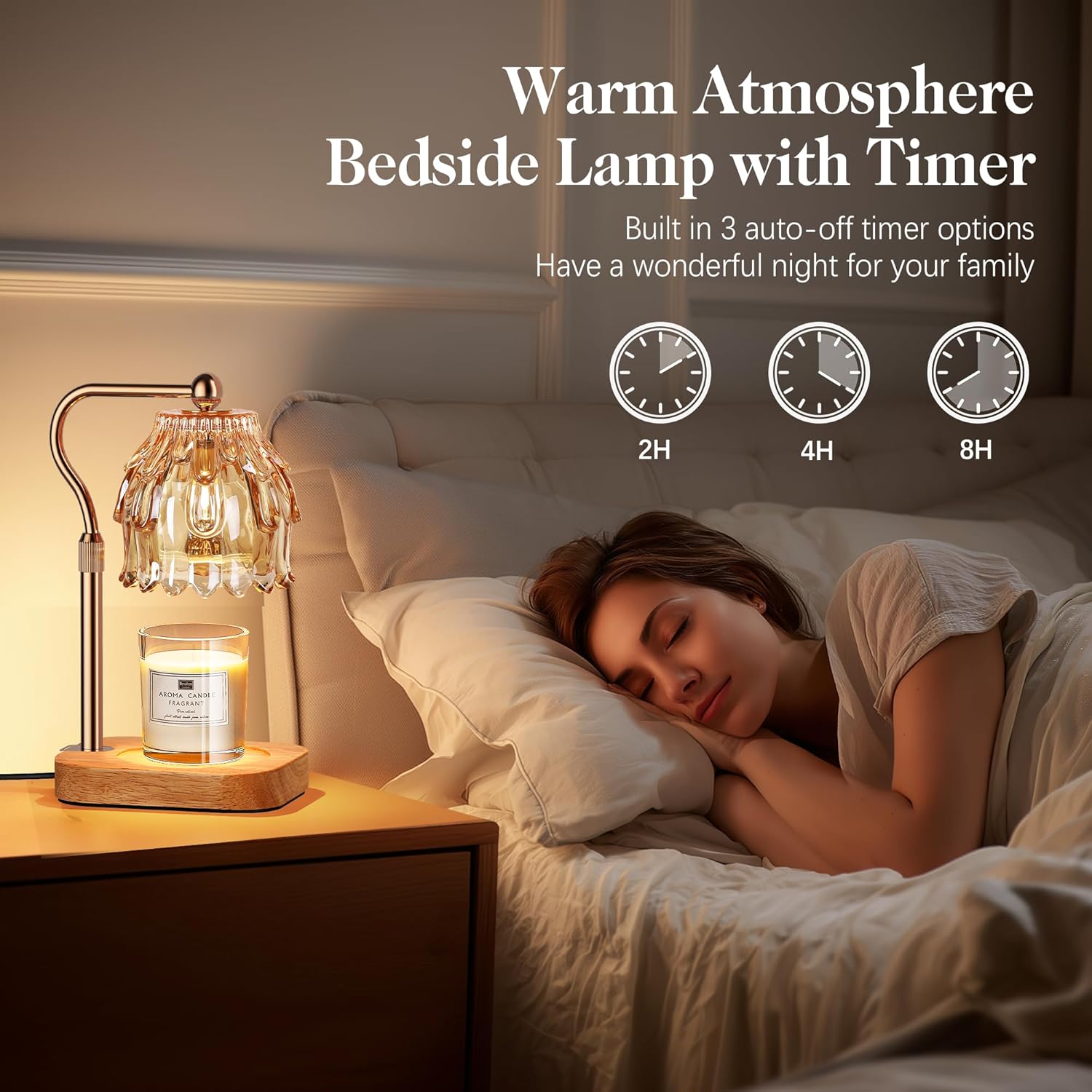 - Modern Decoration Wax Melt Warmer: Our candle warmer lamp with timer design is unique, featuring a wooden base, a metal gold lamp body, and flower glass lampshade as the main body, adding a touch of charm and coziness to any room, modern and luxurious. Wax warmer for scented wax creates a cozy atmosphere and casts nice ambient light. Perfect for enhancing moments of yoga, reading, entertaining, work, or sleep. Enjoying the fragrance with peace of mind, sleep and play anytime