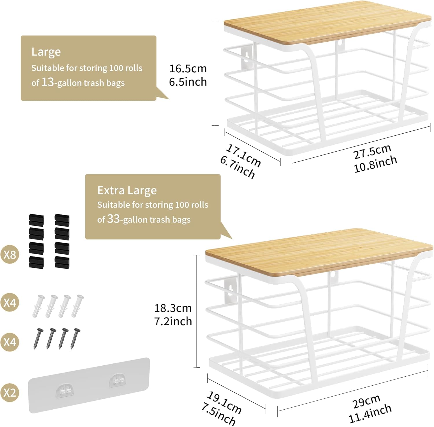 - Versatile Use for Home Organization:From pantry organization to laundry room storage. Assign the large garbage bag dispenser under sinks, use the small wall basket for kitchen sink accessories, or mount both as bathroom organizers