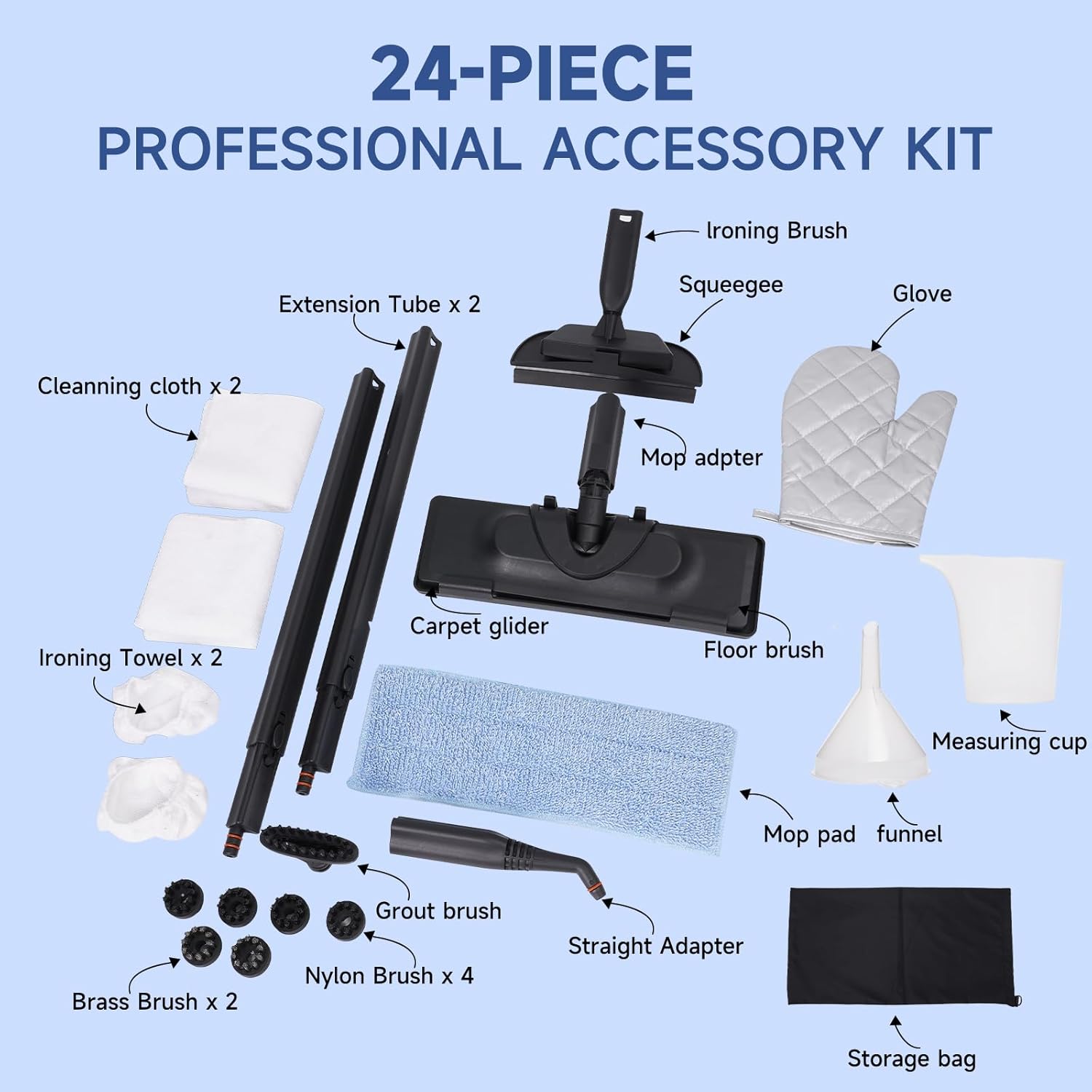- ALL-IN-ONE WITH 24 MULTI-FUNCTIONAL ACCESSORIES: This versatile multipurpose steam cleaner includes 24 useful attachments: Extension Tube x2, Big Nozzle x1, Mop Adapter x1, Ironing Brush x1, Squeegee x1, Carpet Glider x1, Nylon Brush x4, Brass Brush x2, Plastic Brush x1, Floor Towel x1, Ironing Towel x2, Cleaning Cloth x2, Measuring Cup x1, Funnel x1, Glove x1, Storage Bag x1, transforming it into a multi-surface steam cleaner for walls. With this advanced floor steam cleaner, every corner of your home gets a professional-level clean.