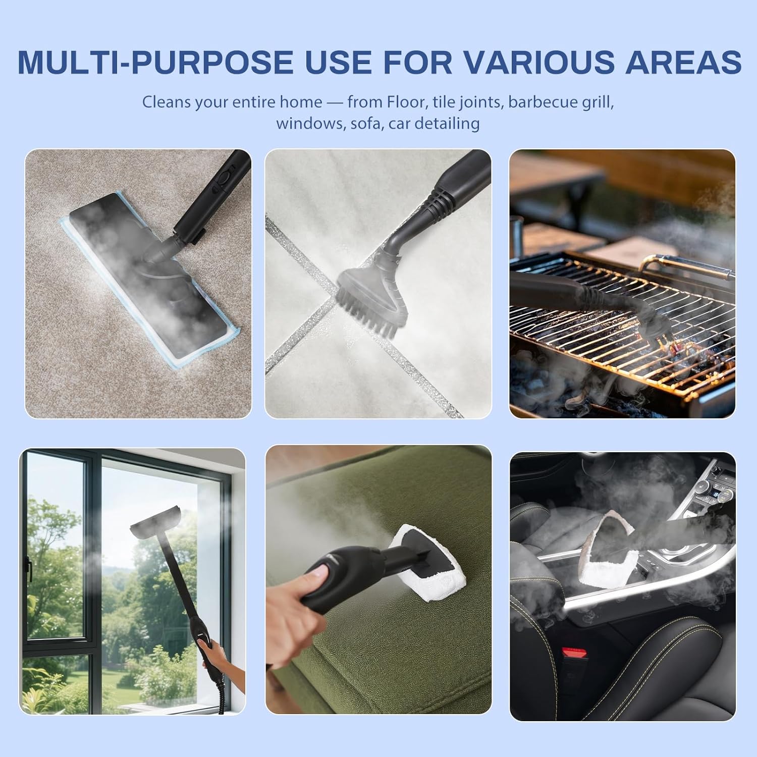 - WIDE APPLICATION FOR ALL CLEANING SCENARIOS: Designed for home use, this multipurpose steam cleaner is ideal for kitchens, bathrooms, floors, carpets, cars, sofas, mattresses, toilets, windows, curtains, walls, ovens, and even clothing. The flexible hose and long power cord provide excellent maneuverability, making this steam cleaner for walls and floor steam cleaner combo your go-to tool for tackling everyday messes or deep-cleaning projects.