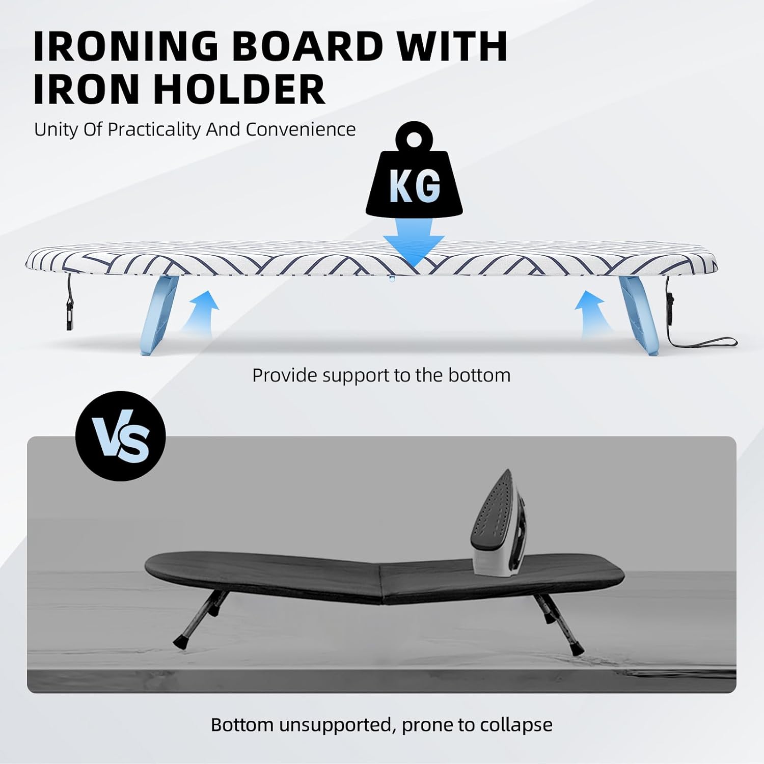 - [Foldable & Space Saving Design]This small ironing board folds effortlessly for compact storage. After folding, the table top ironing board measures 32"x12" and only 2 inches in thickness, ideal for most small places.