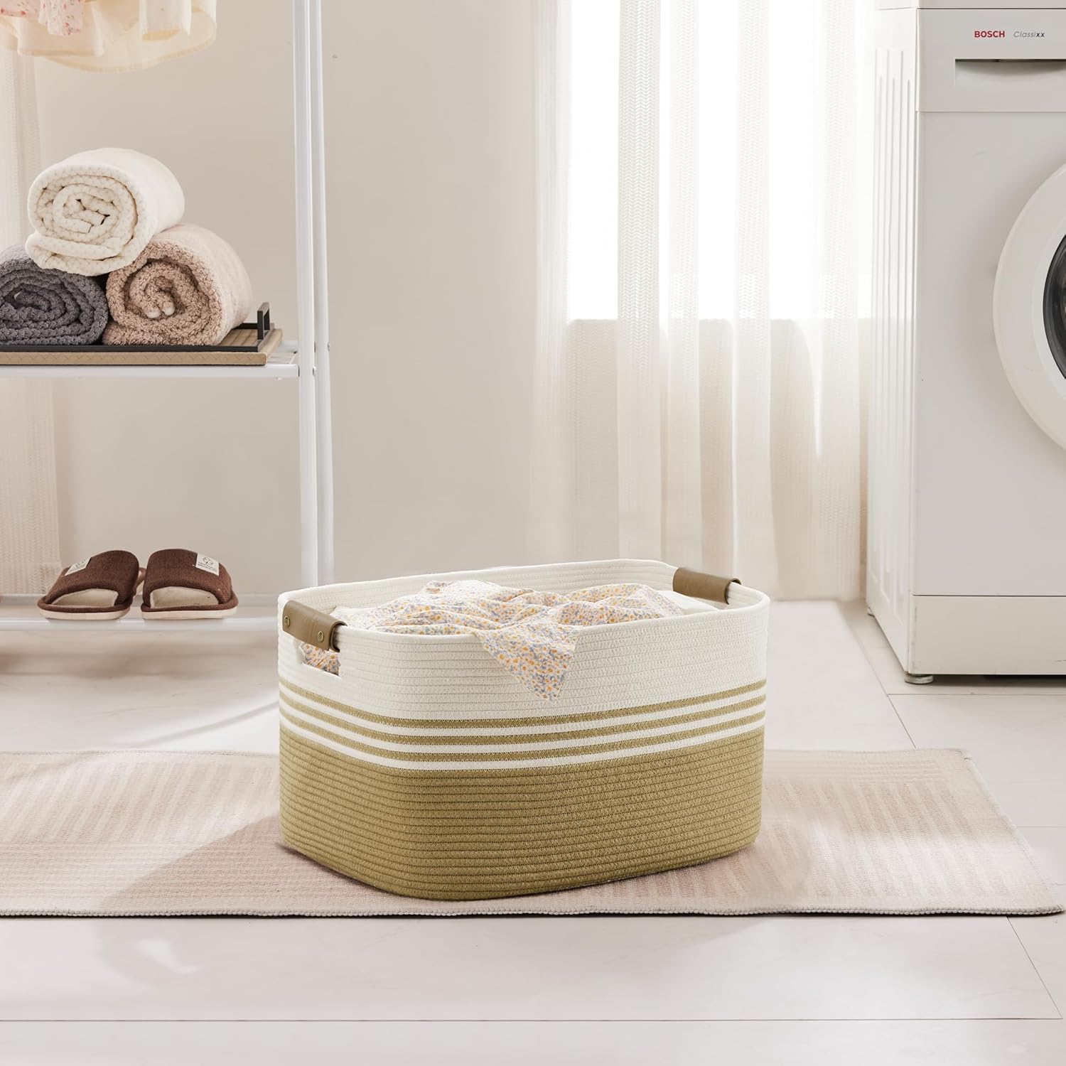 - STYLE MEETS VERSATILITY: Khaki boho storage basket. Laundry basket with vintage colors and patchwork stripe elements, which can perfectly integrate both bohemian and modern styles, is not only suitable for home, but also suitable for single apartments, student dormitories, offices and other scenes