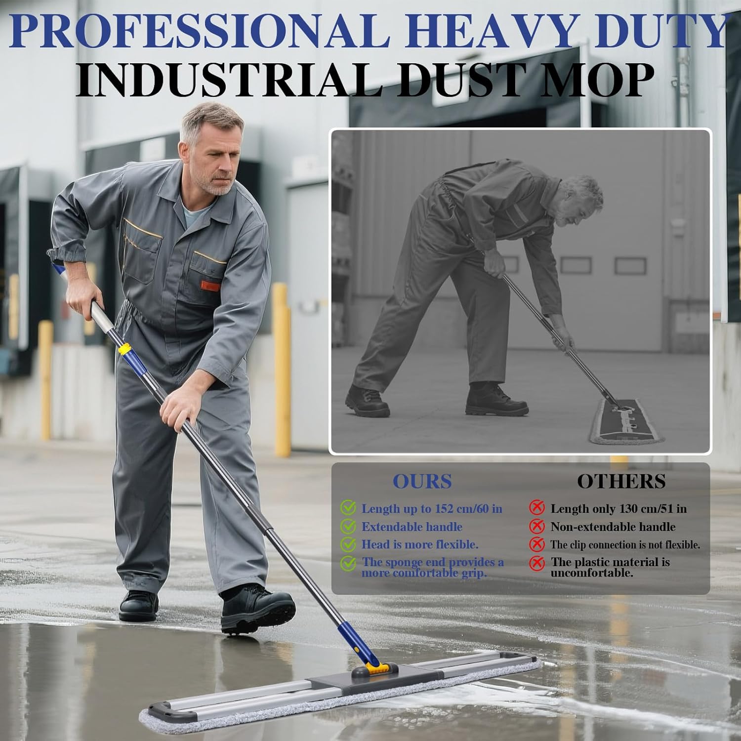 - Large Mop: This professional commercial dust mop is equipped with a 36" extra-large cleaning head. Compared with traditional industrial mops, it is more efficient and can clean larger areas. It is suitable for warehouses, factories, supermarkets, schools, hotels, shopping malls, and other large venues.