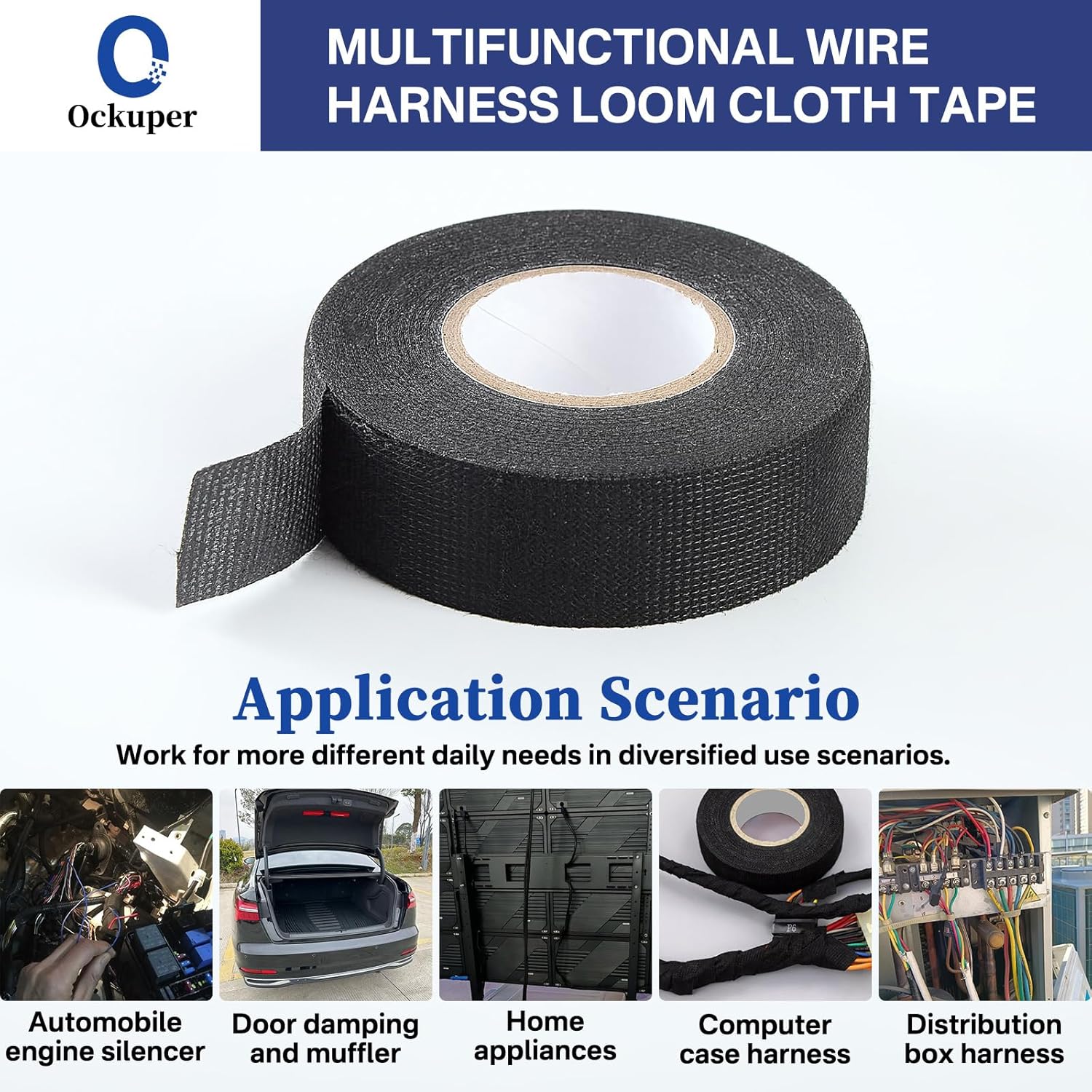 - Wide application: A set of 5 rolls wire harness cloth tap; SIZE: Each roll black electrical harness tape is 49 FT long and 0.98 inch wide,Based on the above characteristics, the tape is widely used in household, industrial and automobile maintenance fields.