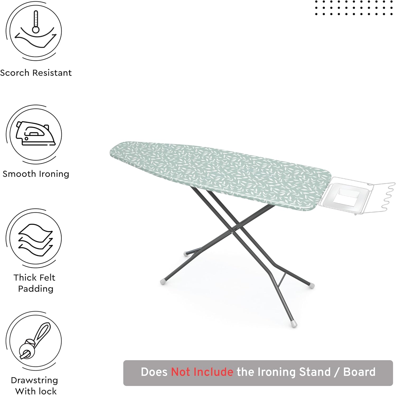 Encasa XO Ironing Board Cover and Pad 42"x14" - Thick 3mm Felt Padding, Drawstring Tightening & Lock, Easy Fit, Scorch & Stain Resistant, Fits Medium Ironing Board - Green Leaflet