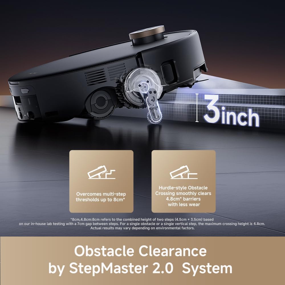 - Adaptive All-Terrain Mobility β StepMaster 2.0 with LiftPro Chassis climbs thresholds up to 8cm, while the ultra-slim 96mm design with FlexScope Navigation glides under sofas, beds, and cabinets. From high obstacles to low-clearance spaces, Z60 delivers complete room coverage without interruption.