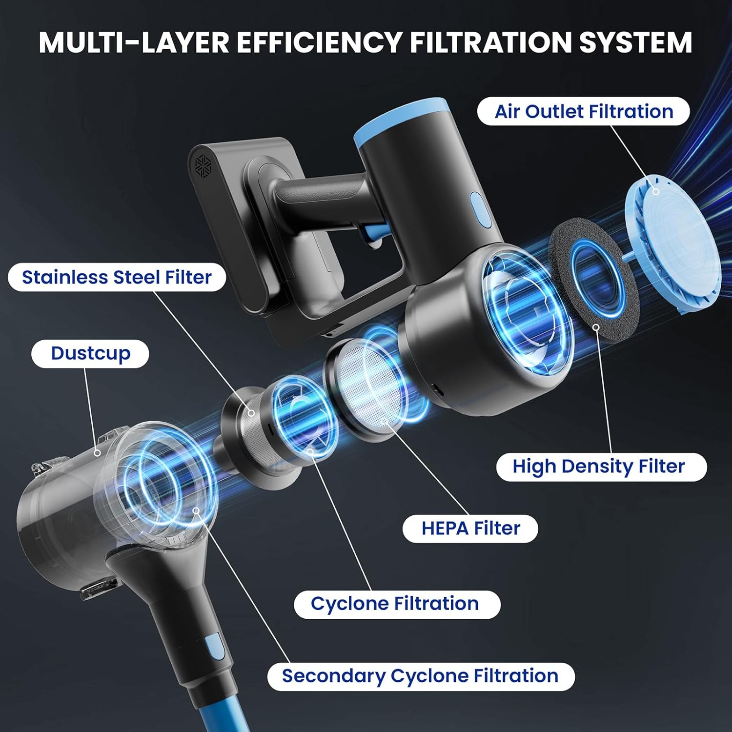 - ăMulti-Layer Filtration for Cleaner Air & Hassle-Free DisposalăThis cordless vacuum cleaner features a multi-layer sealed cyclone filtration system that efficiently captures fine dust using a high-performance HEPA filter, locking debris securely in the dust cup. The bottom-release dustbin allows one-touch, hands-free emptyingâmaking cleaning more convenient, hygienic, and mess-free.