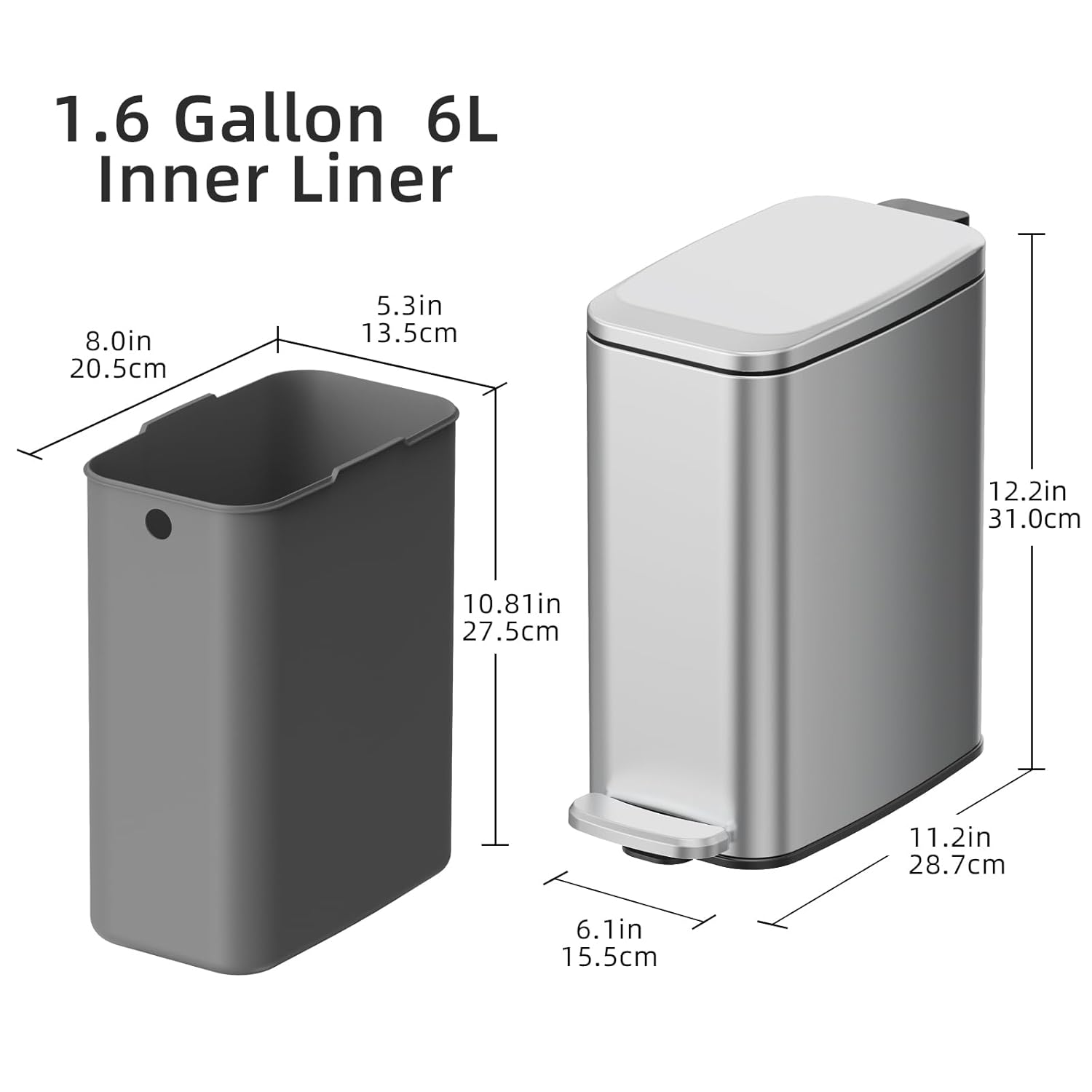 KUK Slim Bathroom Trash Can with Lid, 1.6 Gal / 6L Stainless Steel Small Garbage Bin with Detachable Inner Bucket, Step Pedal, Silent Close, Wastebasket for Toilet, Bedroom, Home, Office (Silver)