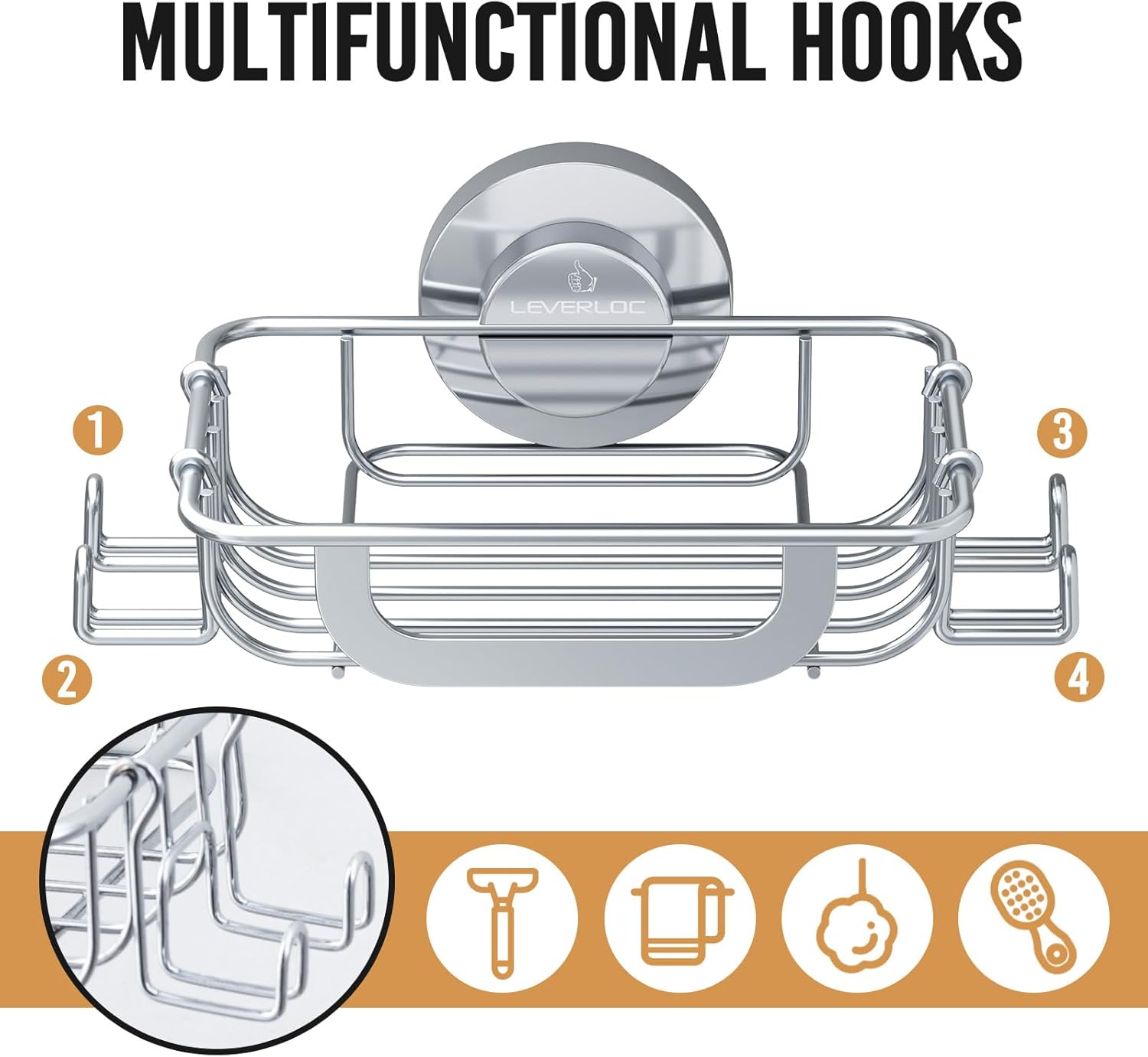 LEVERLOC Bar Soap Holder Dish with Hooks, Soap Tray Suction Cup Wall Mounted for Shower, Stainless Steel Sponge Holder Caddy for Bathroom Kitchen Sink Organizer, Rustproof, Silver