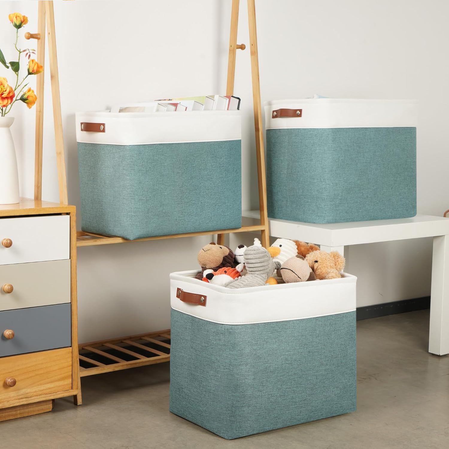 DULLEMELO Large Rectangular Baskets for Blankets 51L Canvas Storage Baskets for Organizing 3 Pack Collapsible Baskets Bins for Organizing Home Office with Handles (White&Deep Green)