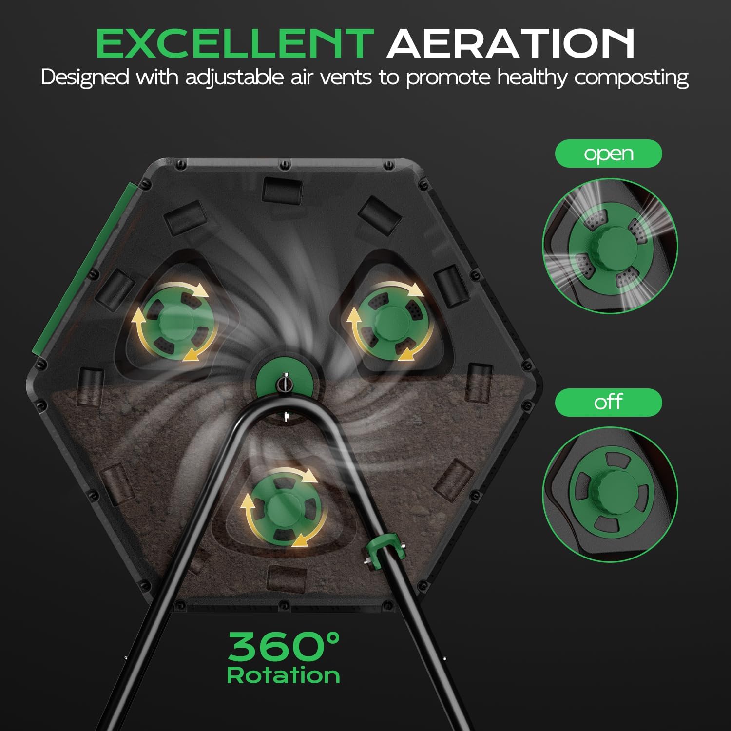 - 【Adjustable Ventilation Control】Optimize decomposition with the adjustable airflow system. This dual chamber compost tumbler features multiple adjustable vents. Easily open/close them to manage moisture, oxygen, and temperature. Prevent odors during active phases or retain heat for faster breakdown