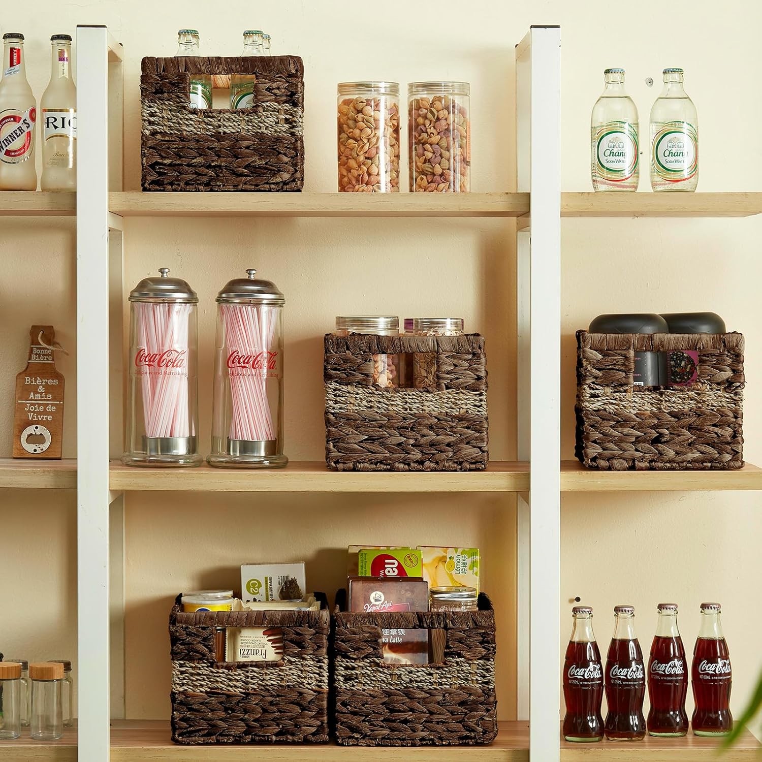 - βChic Basket Design: With natural materials design, this water hyacinth and seagrass basket with built-in handles complements any home decor style. Shelf baskets' earthy tones and organic texture add a touch of warmth and charm to your living space, while its practical shape make it a functional addition to any room.