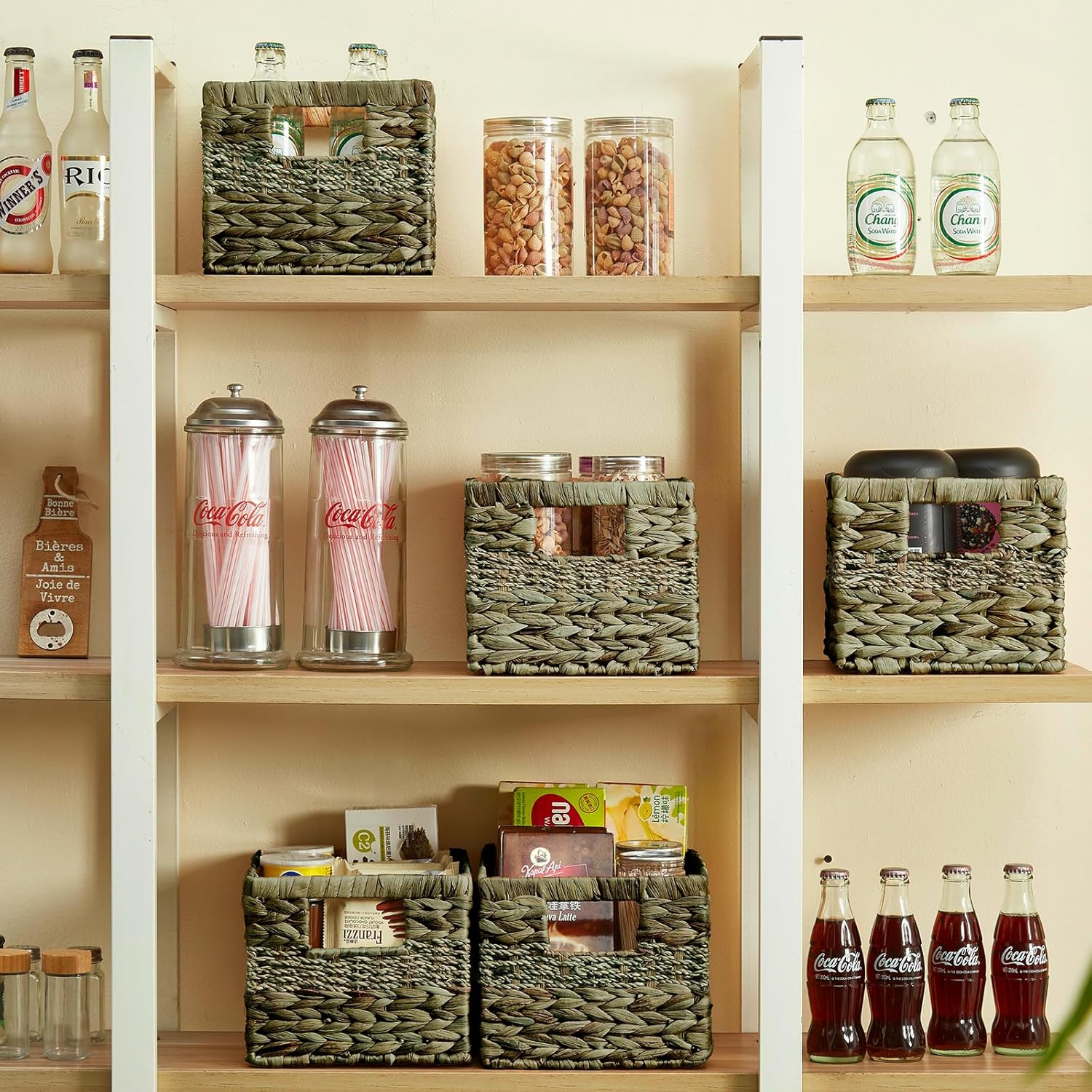 - βChic Basket Design: With natural materials design, this water hyacinth and seagrass basket with built-in handles complements any home decor style. Shelf baskets' earthy tones and organic texture add a touch of warmth and charm to your living space, while its practical shape make it a functional addition to any room.