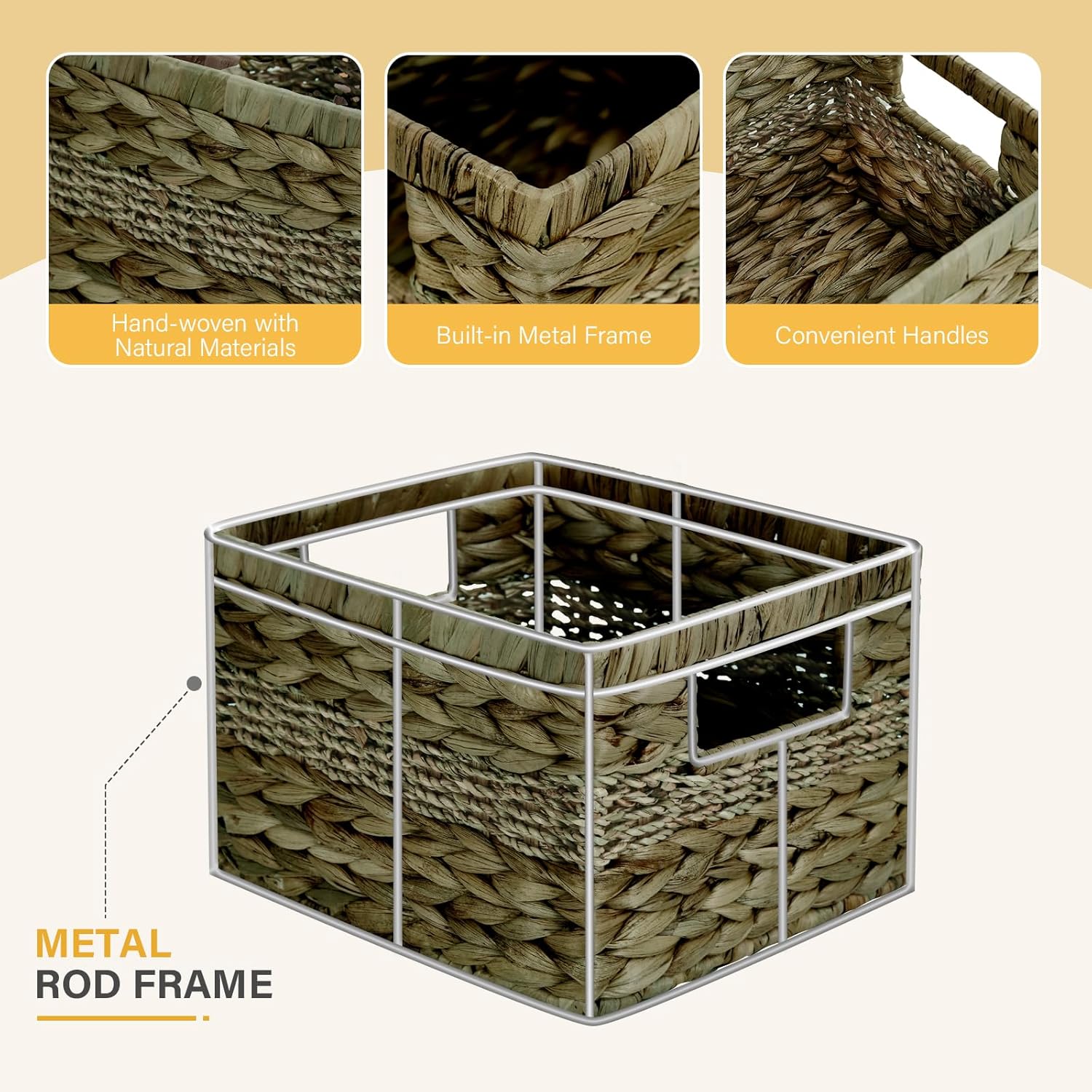 - Renewable Materials: Pantry organizers and storage crafted from a blend of water hyacinth and seagrass on a metal fram, harmonizes strength with organic texture. The 100% natural materials of woven basket ensure a guilt-free purchase, while the artisanal woven pattern adds rustic elegance to modern or minimalist spaces.