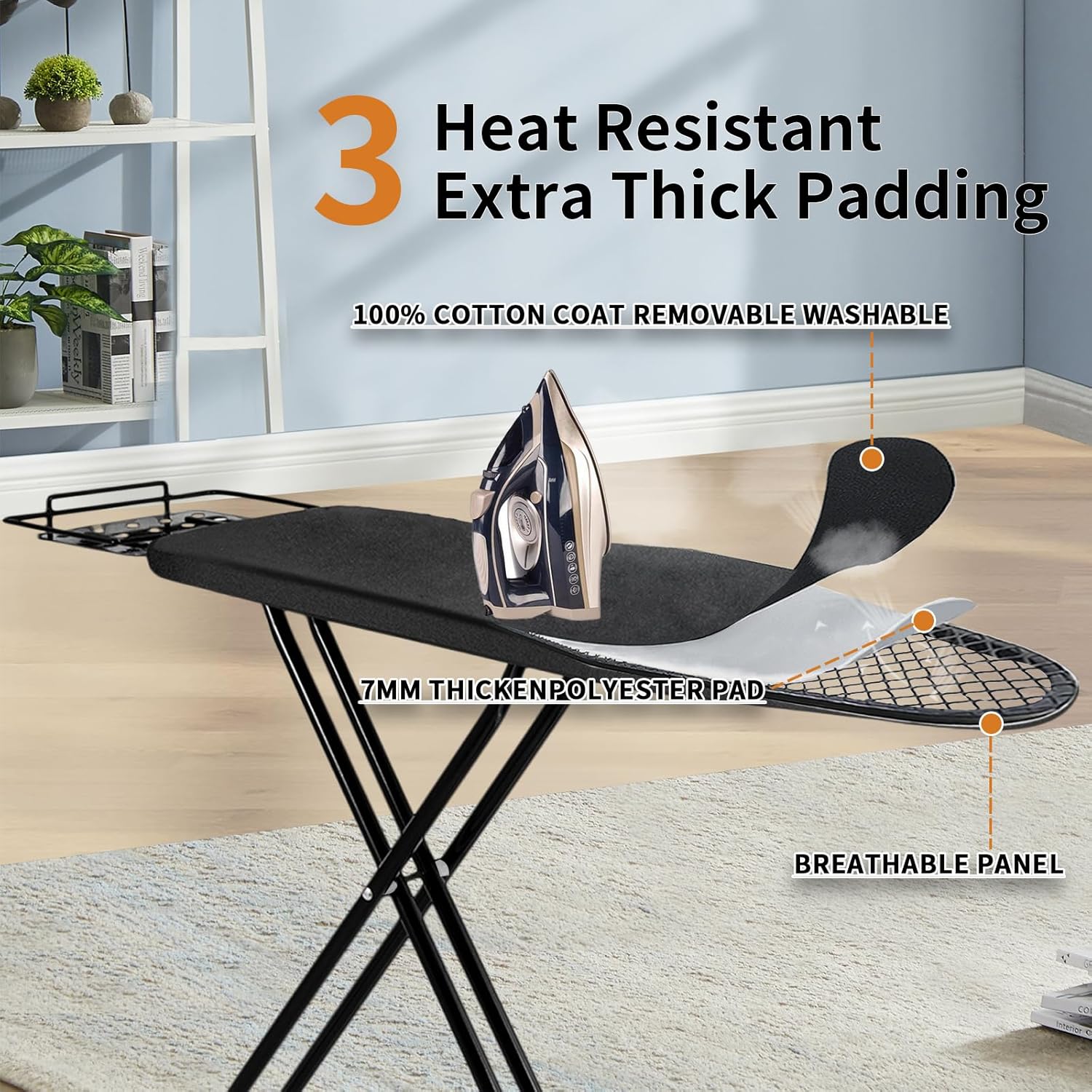 - Heat-resistant: This iron board utilizes heat-reflective needle-punched cotton and sponge padding for high-temperature resistance. Its breathable surface prevents lint buildup, ensuring fabrics remain perfect, and the removable cover is easy to clean