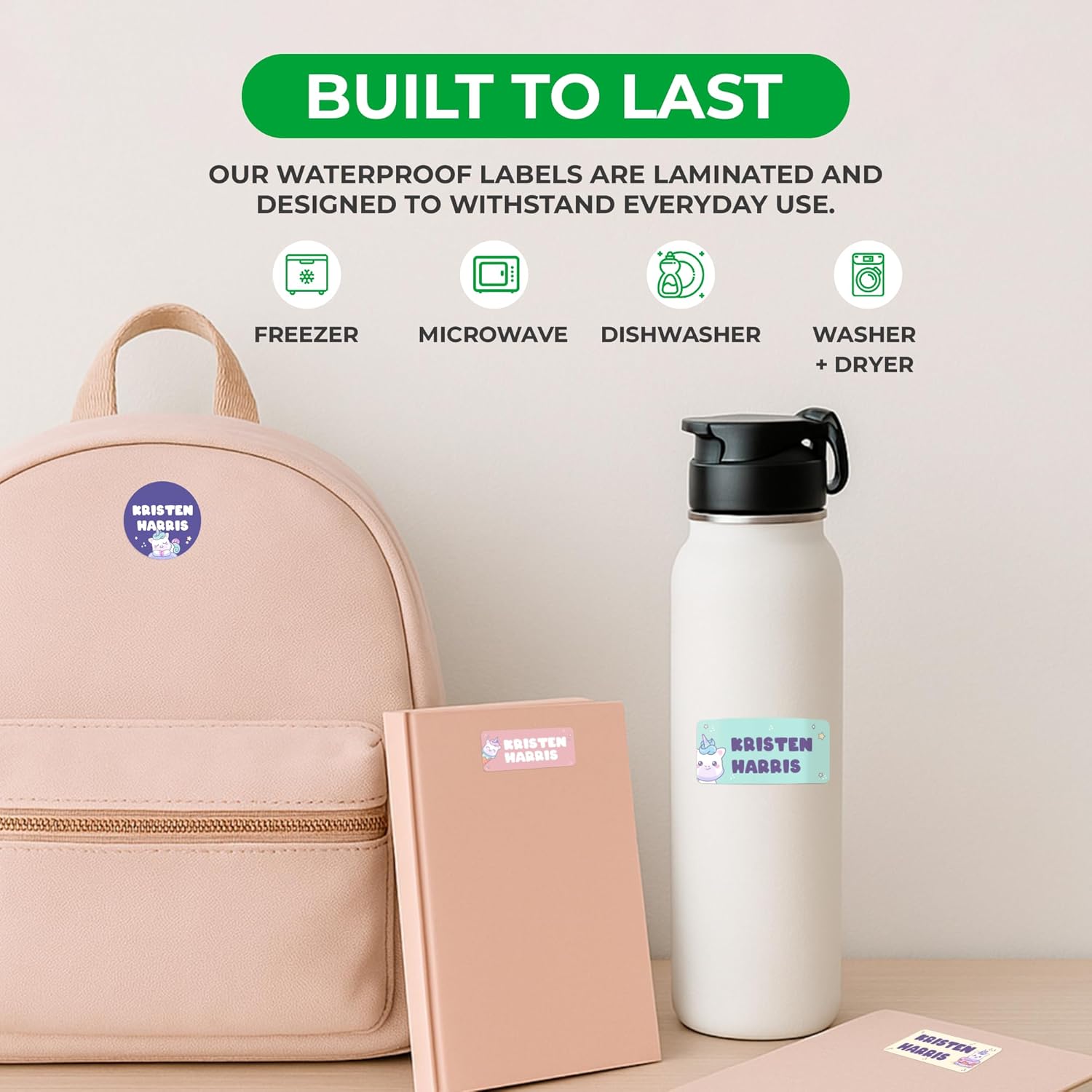 - 💧 Waterproof Stickers & Fade-Resistant — Laminated for long-lasting use, our custom stickers personalized won’t peel, fade, or rub off. Keep your kid’s name visible no matter where the day takes them. These waterproof vinyl labels stick to bottles, lunch boxes, clothing, notebooks, and more. Designed to survive dishwashers, microwaves, freezers, and even washer/dryers!