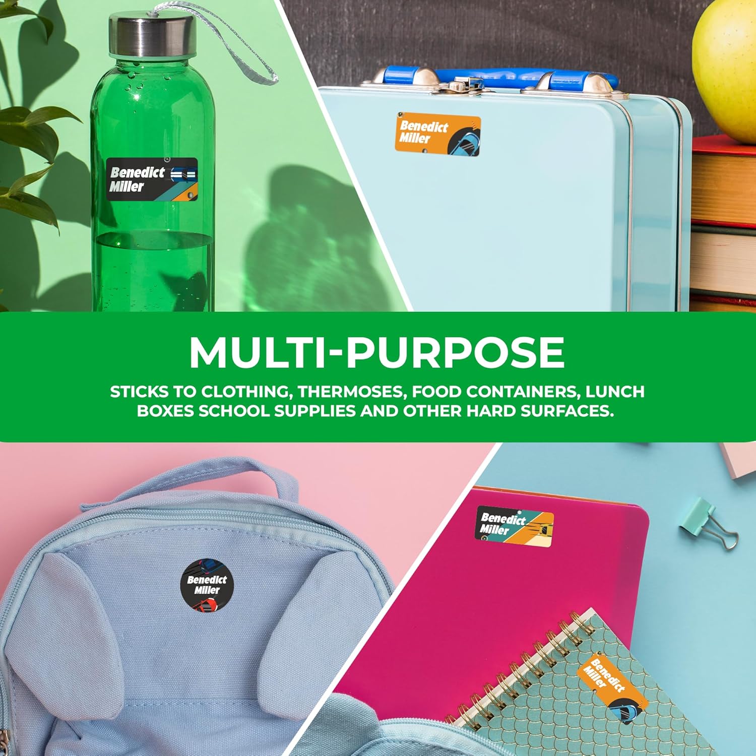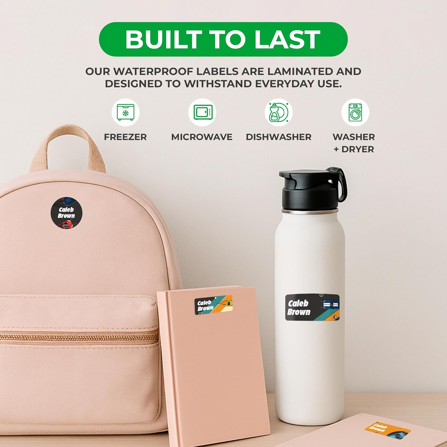 - 💧 Waterproof Stickers & Fade-Resistant — Laminated for long-lasting use, our custom stickers personalized won’t peel, fade, or rub off. Keep your kid’s name visible no matter where the day takes them. These waterproof vinyl labels stick to bottles, lunch boxes, clothing, notebooks, and more. Designed to survive dishwashers, microwaves, freezers, and even washer/dryers!