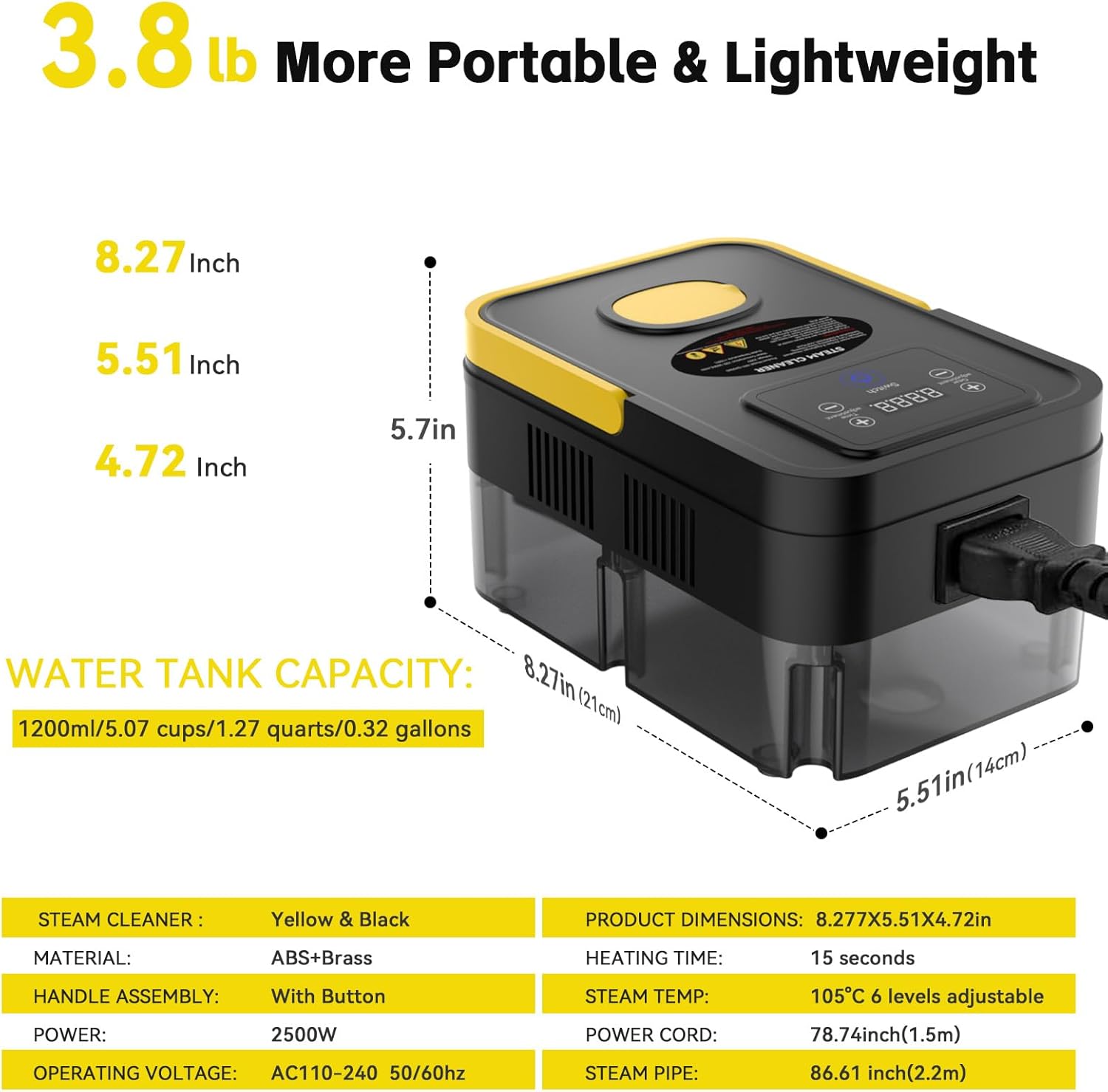 - 【Holds up to 1200ml ≈ 5 Cups (1.25 quarts / 0.32 gallons)Water Tank Capacity】1200ml (≈ 5 Cups) Large Water Tank make clean longer without constant refills! The flip-open lid makes topping up easy—no cooldown needed. One fill gives you up to 45 minutes of powerful steam, perfect for big cleaning jobs. TIPS: To prevent overfilling, it is recommended to keep the water level at or below this capacity.