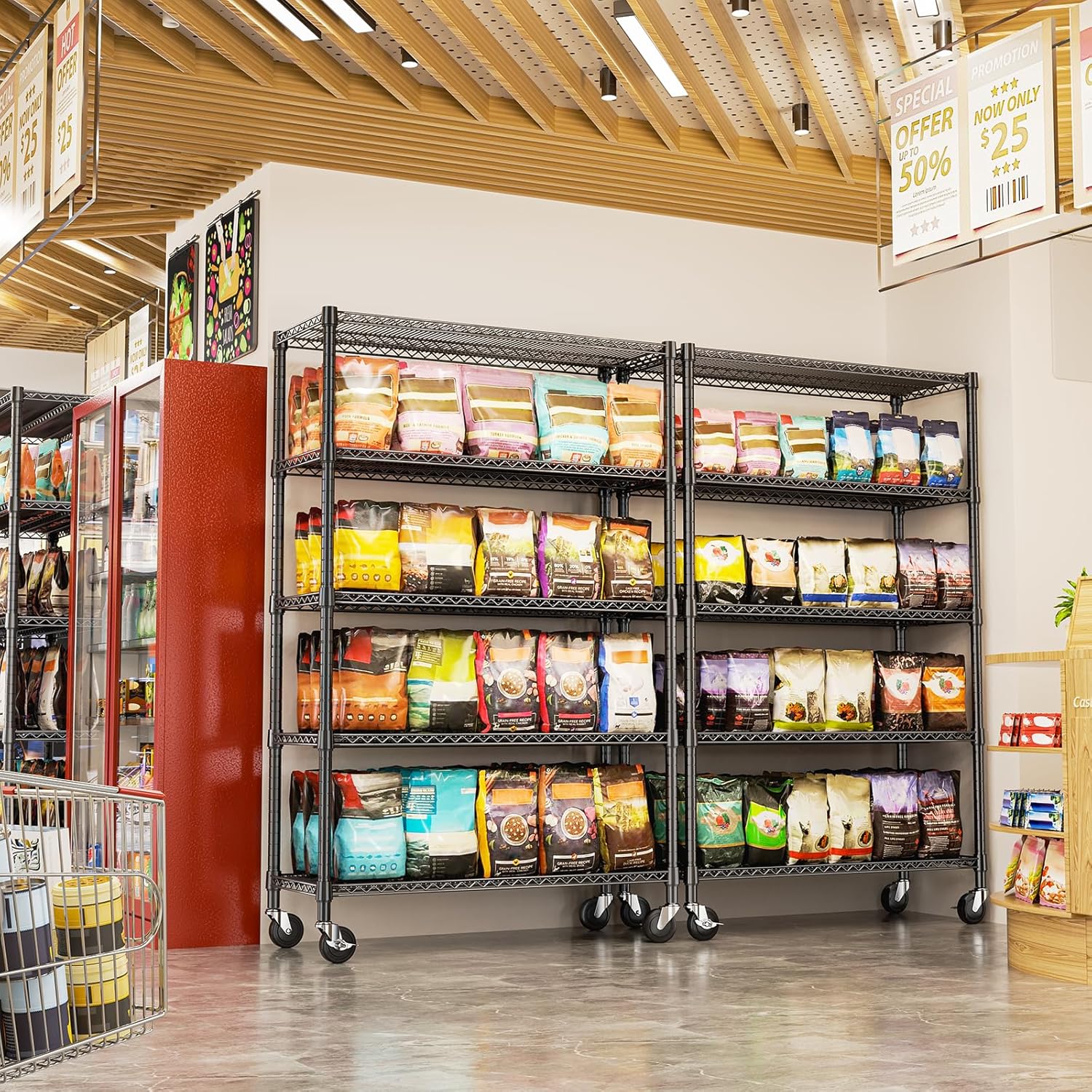- COMMERCIAL-GRADE HEAVY DUTY – Made from high-quality carbon steel with 25.4mm reinforced rods, this heavy duty garage shelving supports up to 660 lbs per shelf and 2640 lbs total on leveling feet (approx. 530 lbs on wheels).