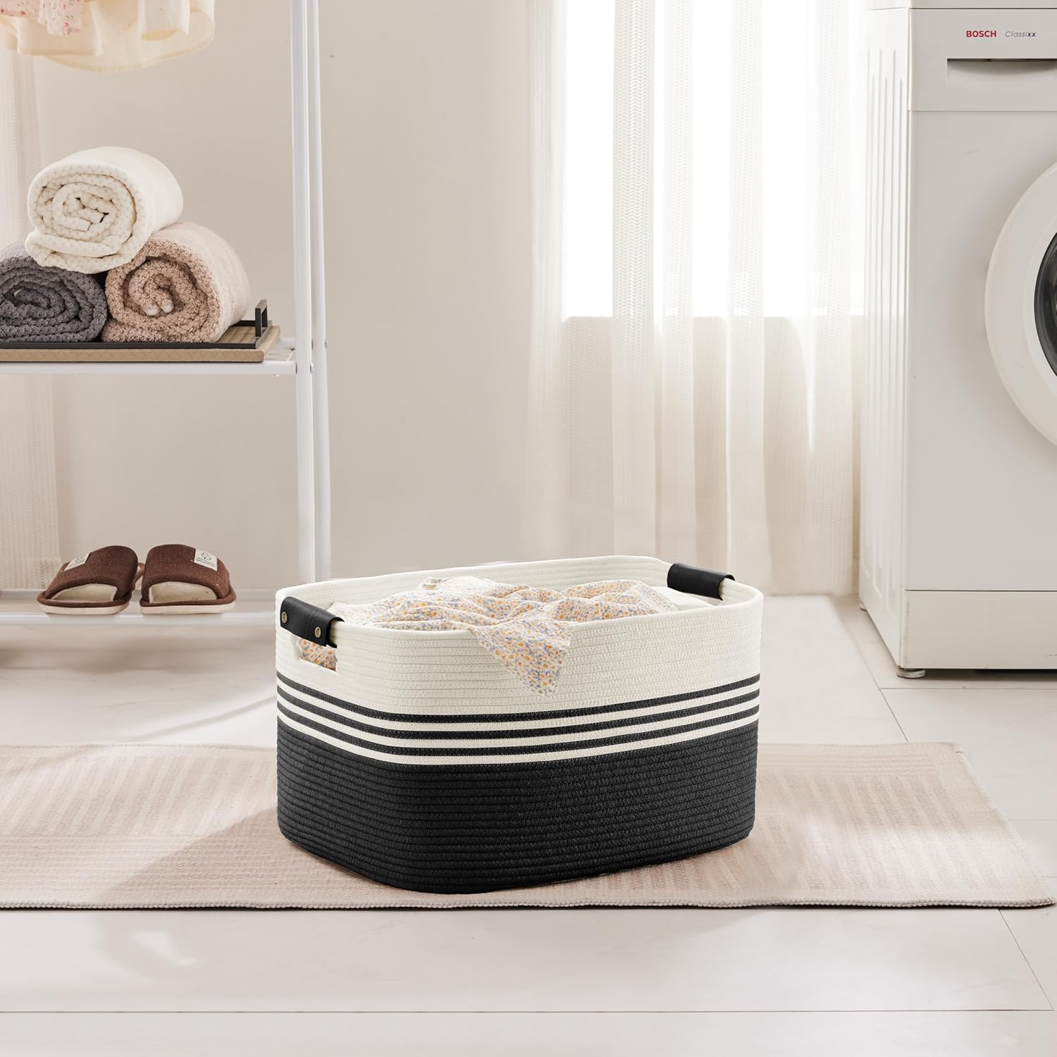 45L Small Laundry Basket with Leather Handles for Living Room Storage, Woven Rope Baskets Bin for Blanket, Kids Toy, Gifts, Wicker Hamper for Bedroom Dirty Clothes, 18"x14"x11" White Black