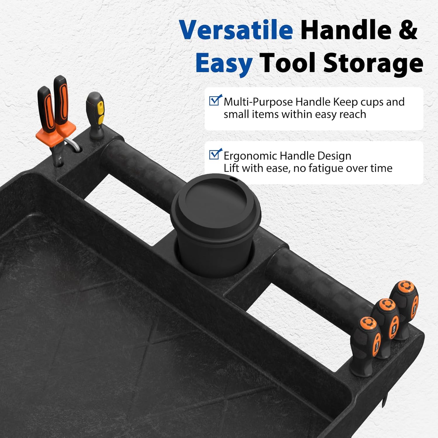 - 【Ergonomic Multifunctional Handle】 Dual handles designed for comfort and reduced fatigue, with a central storage space for cups, tools, or small parts. Perfect for keeping essentials within reach when using this work cart on wheels or rolling tool cart.