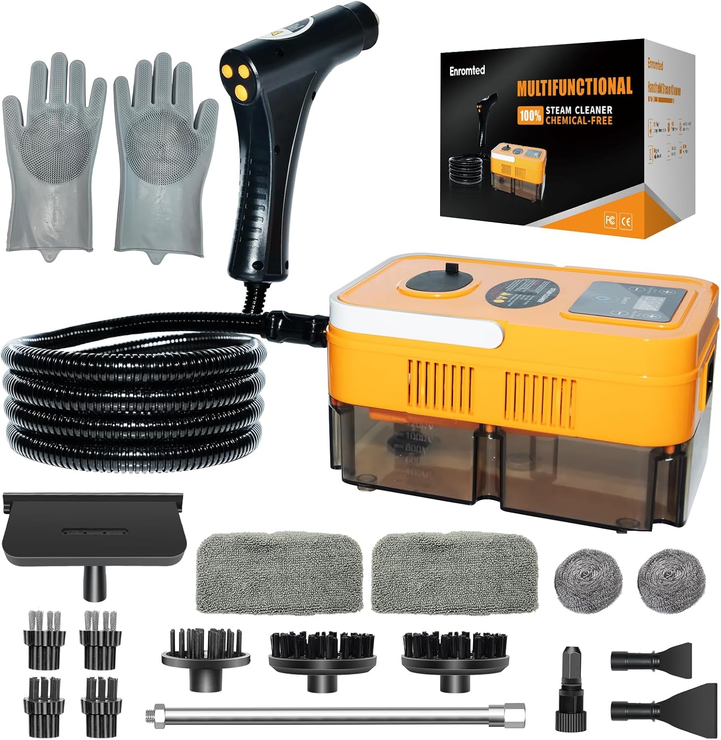 - Portable Steam Cleaner:This multipurpose steam cleaner includes 59-inch power cord and 78-inch steam hose, the body is only 8.3x5.5x4.3-inch Ideal for home cleaning.Handheld steam cleaner for all surfaces with ectended sprayer rodx1、Small shovelx1、Big shovelx1、Steel wire ball plastic partsx1、Glass brushx1、Steel woolx2、Large nylon brushx2、Small wire brushx2、Small nylon brushx2