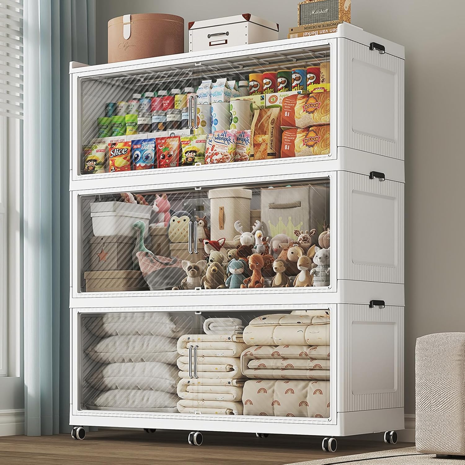 - 【Two Ways to Open & Magnetic Doors】The collapsible storage bins with lids and wheels feature a dual access way, allowing for both top and front door openings, and with clear brown windows for easy visibility. The super huge storage bins with open front doors are equipped with magnetic lock buckles to prevent dust from entering the cabinet.