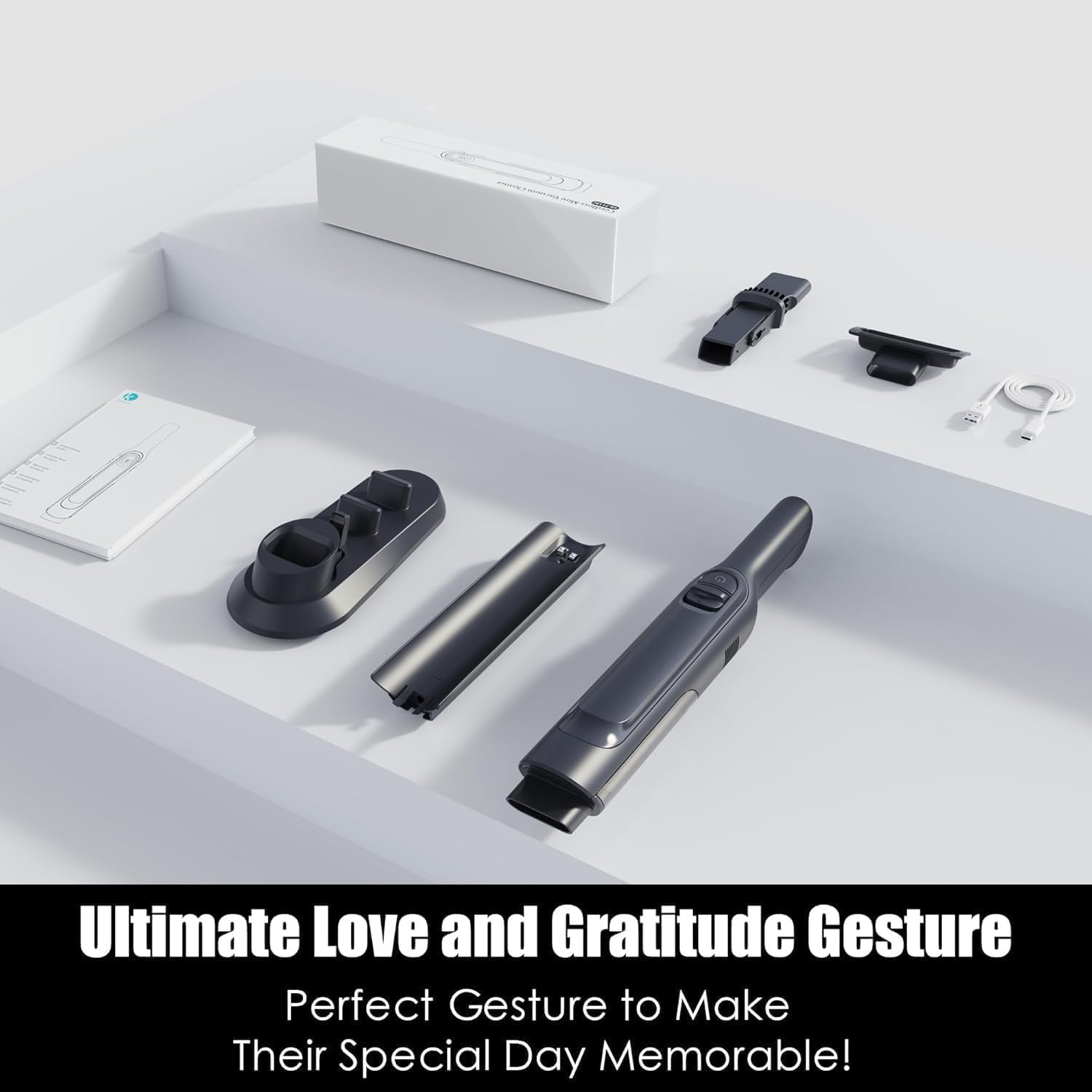 - 【Ultimate Love and Gratitude Gesture】 1x PROMOMO Handheld Vacuum, 1x Duster Crevice Tool, 1x Multi-Surface Pet Tool, 1x Charging Plate, 1x Accessory Storage Dock, 2x H13 HEPA Filter (1 installed), 1x Type-C Charging Cable, 1x User Manual, 1x 12-months Warranty.