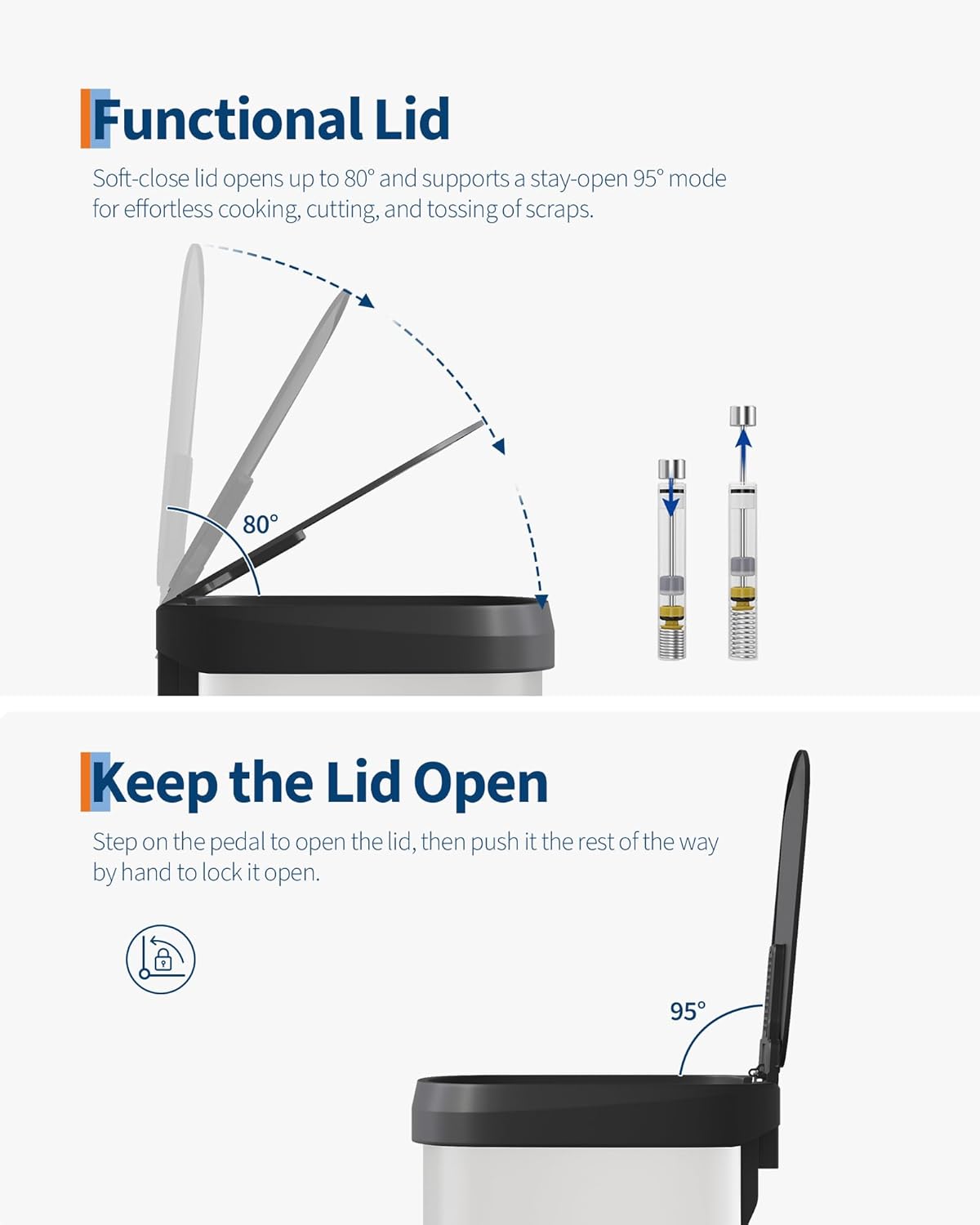- Extended Height and Capacity: This trash can extends to 35.63 inches at full lid opening, perfectly fitting under a standard 36-inch island countertop. Its bucketless interior can hold up to 55 large water bottles or 110 cans, maximizing storage without taking up extra floor space.