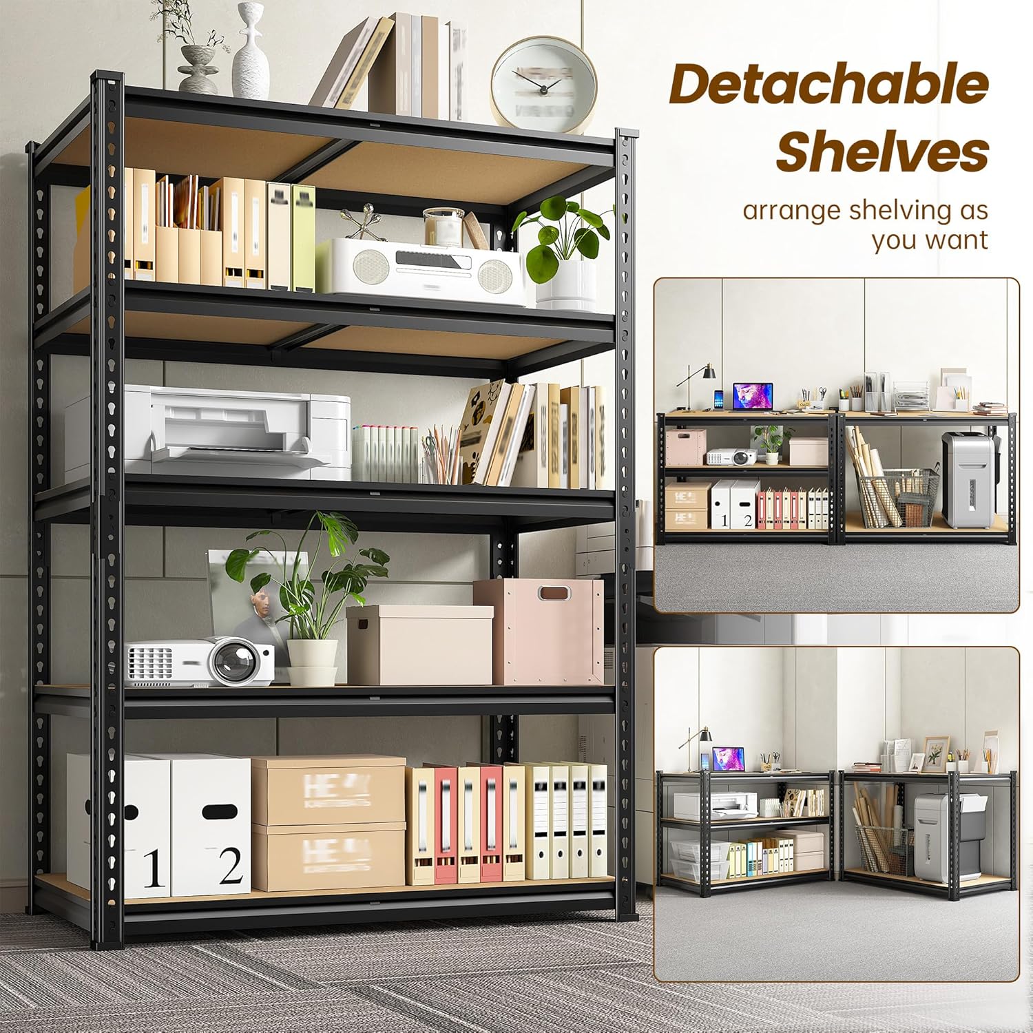 - ăAdjustable and Detachable Metal Shelvesă You can customize the height of the shelves according to your home needs. The metal shelving is designed with adjustable connectors, and each layer can be adjusted according to the height of the items. In addition, you can freely disassemble and combine your storage racks according to your needs. The shelving unit can be transformed into workbenches or corner shelves to effectively utilize storage space