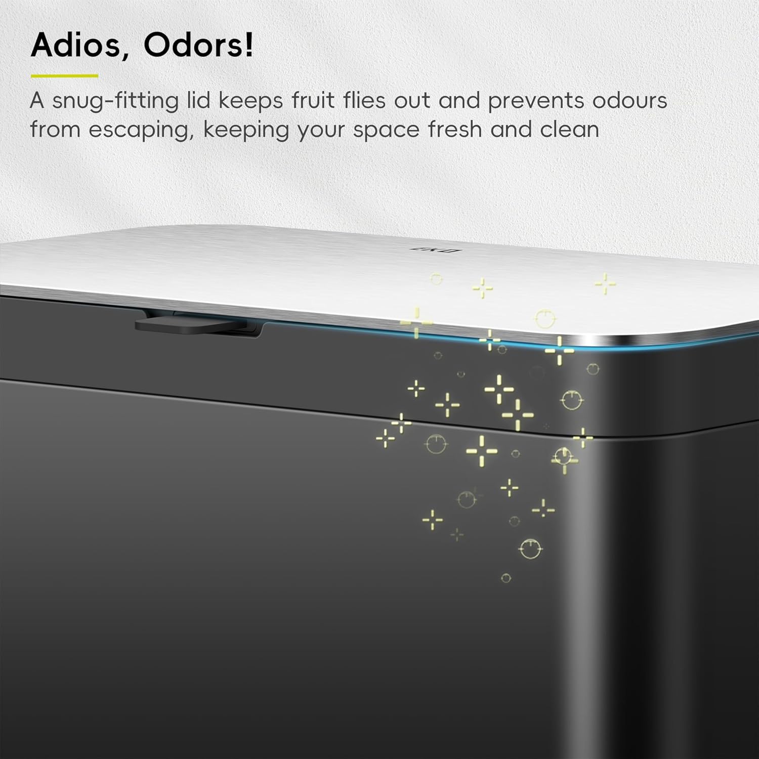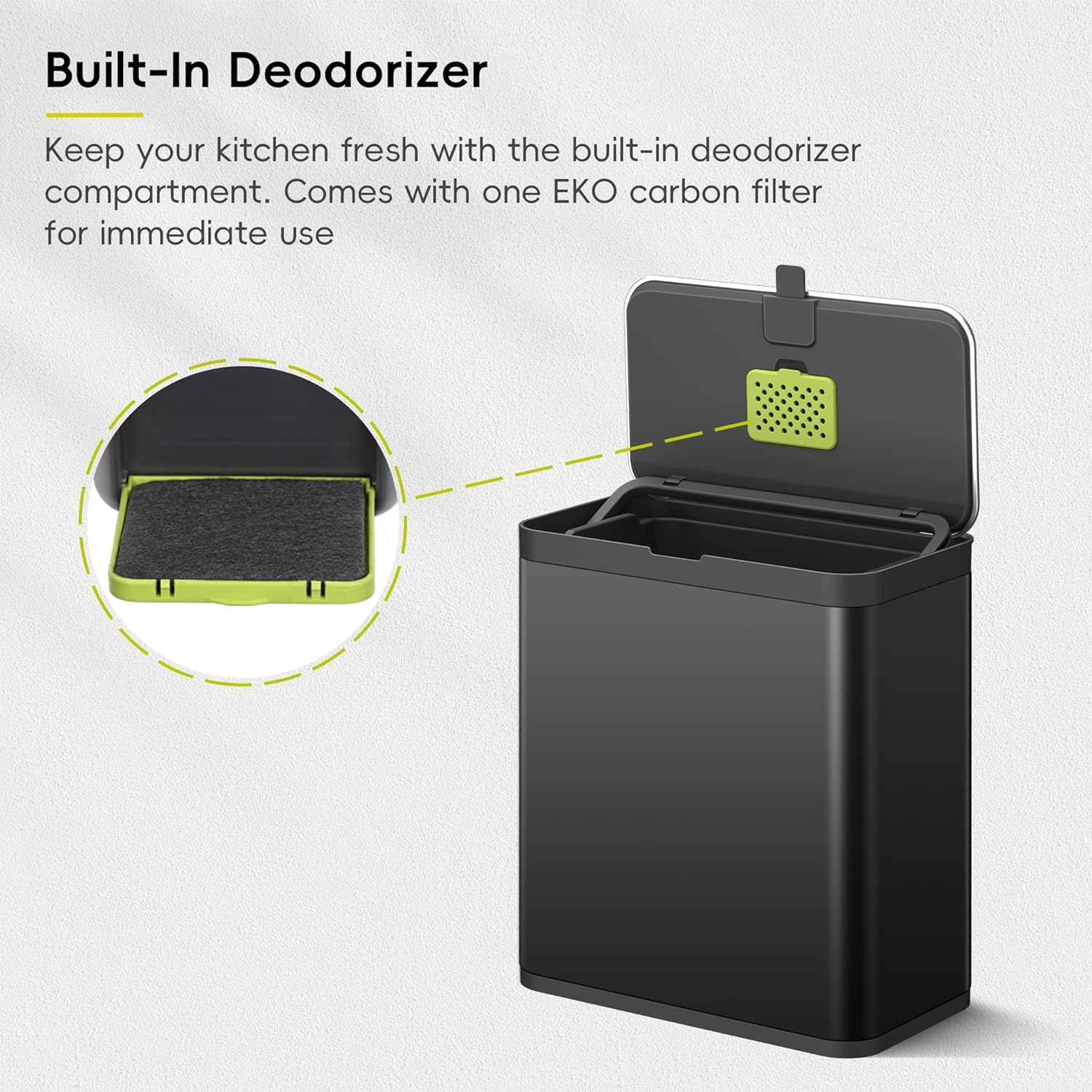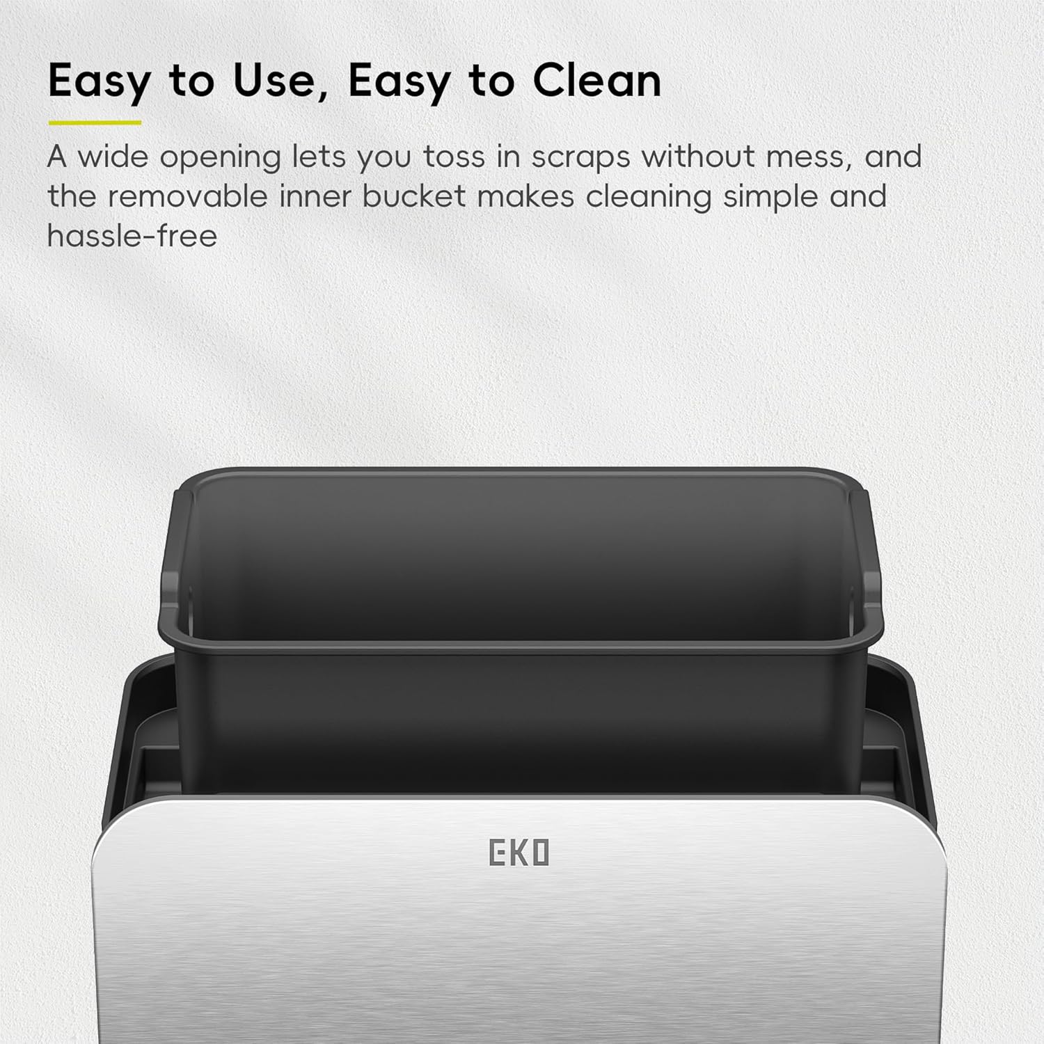 - Fresh & Odour-Free - A snug lid and built-in deodorizer compartment—with one EKO carbon filter included—lock in smells and keep fruit flies out, leaving your kitchen clean and fresh