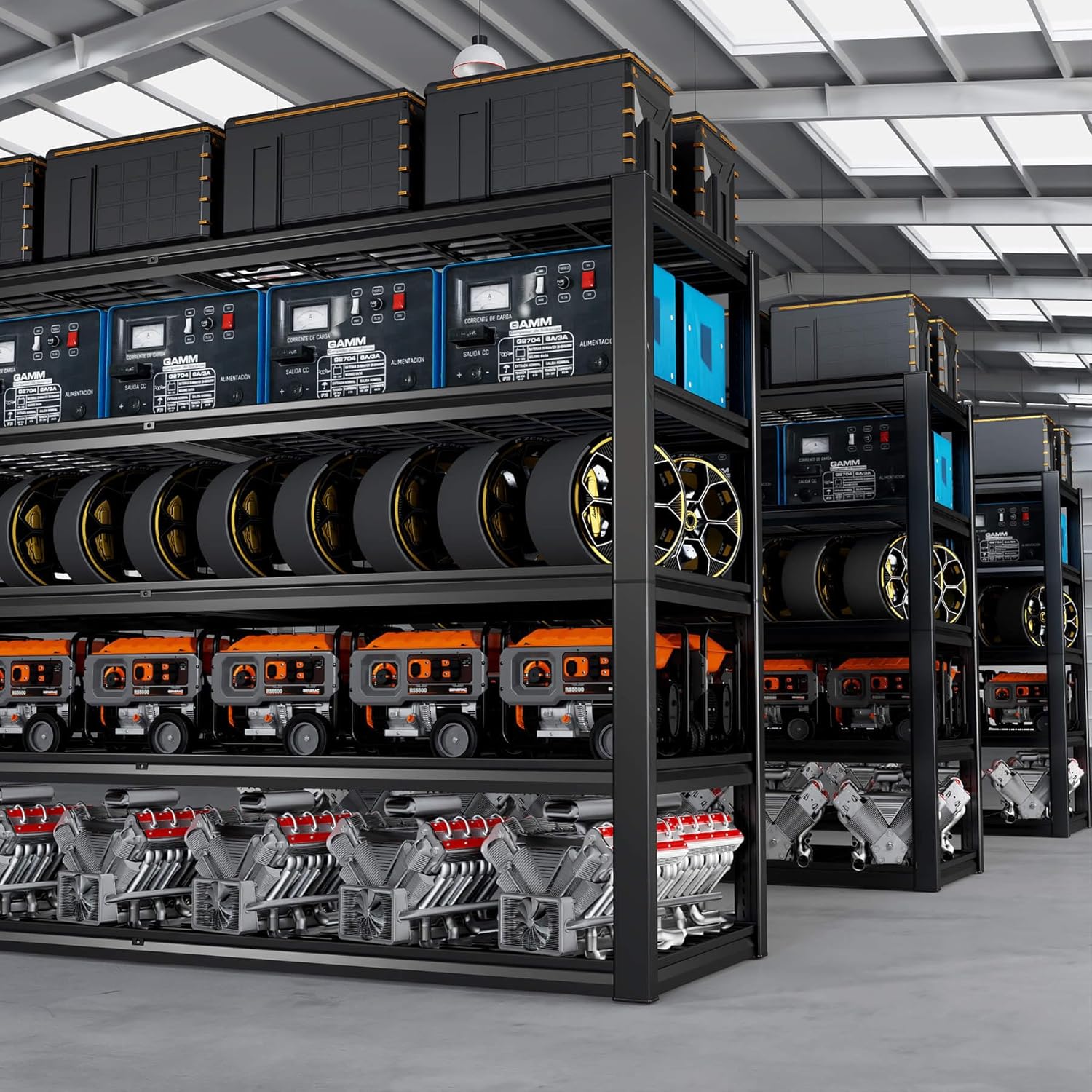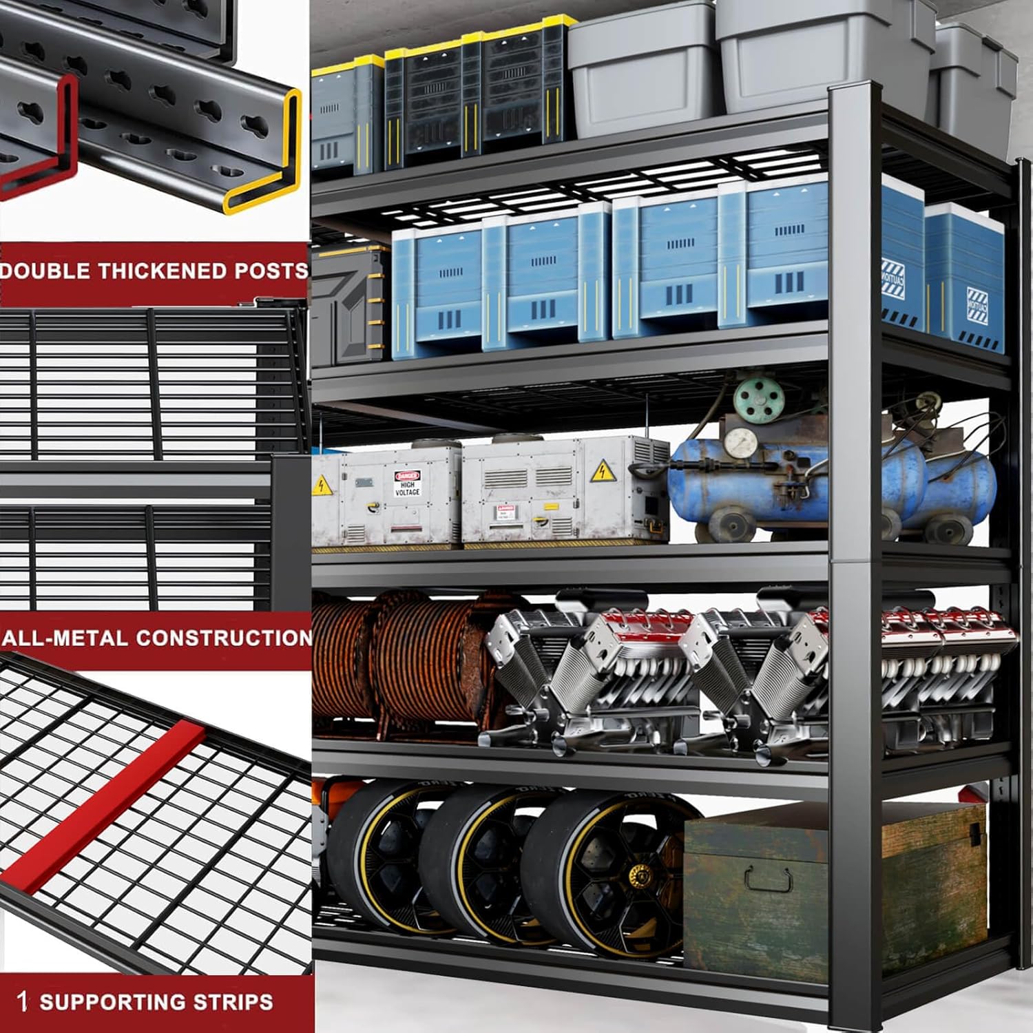 - ăAdjustable Heavy Duty Metal Shelves to Meet Different NeedsăThe height of each tier can be adjusted not only by moving the crossbar to meet the needs of different heights, but also the shelves can be assembled or disassembled into a variety of different metal shelves. The 84-inch tall 3500 lb. load-bearing garage shelves are not only strong, but they also give you more storage space.