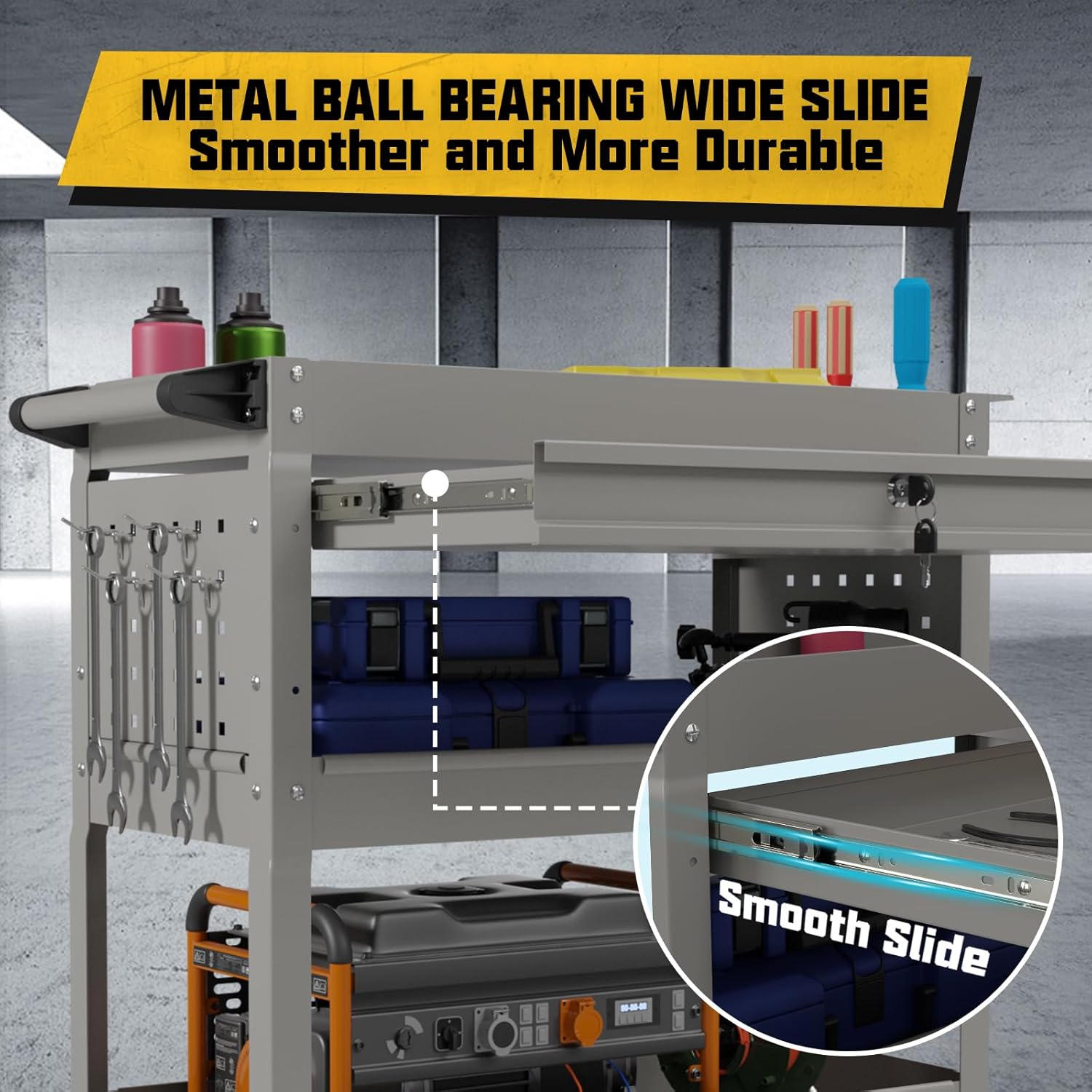 - 【Spacious Storage】This tool cart features 3 tiers of storage space, lockable sliding drawers, and extra tool slots on both sides to organize various tools neatly. Thanks to its high-strength body, it supports a maximum load of 450 pounds, easily handling heavy tools or boxes.capacity of 450 pounds.